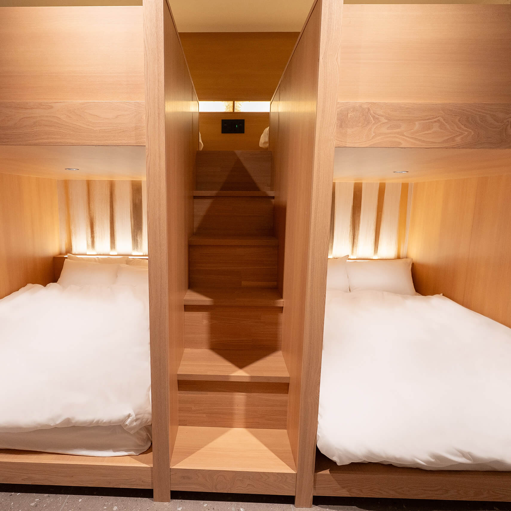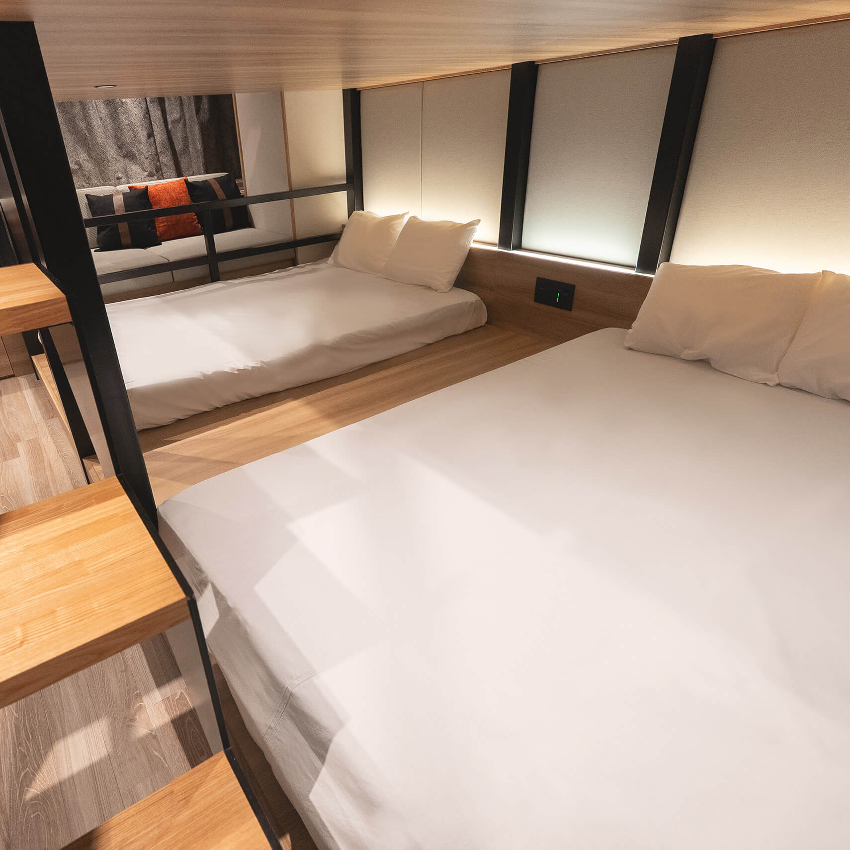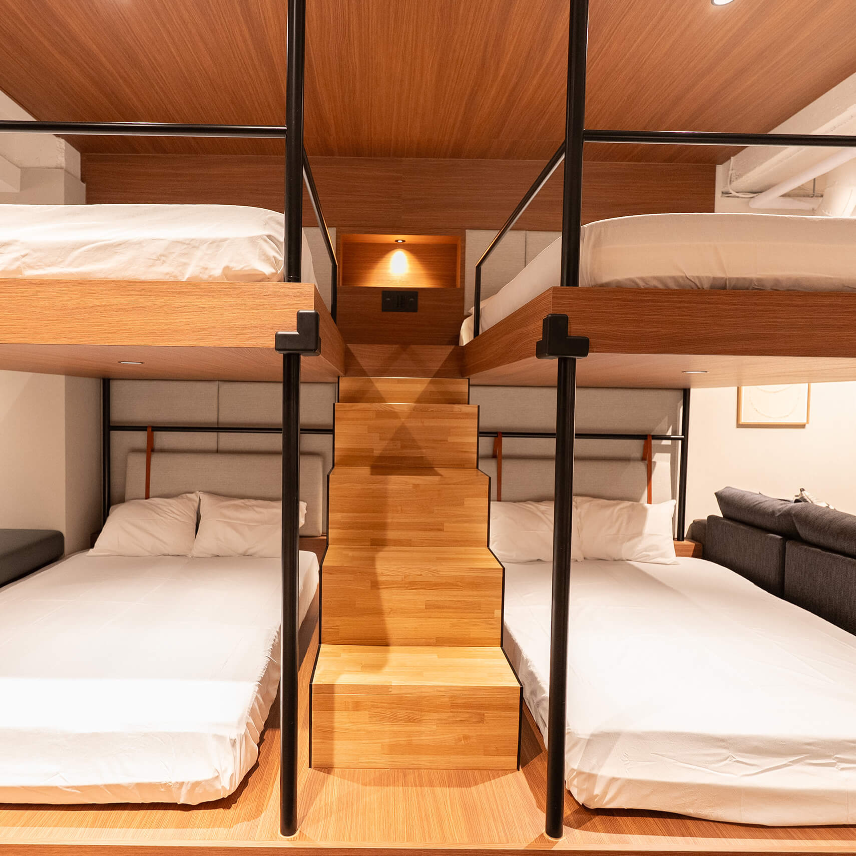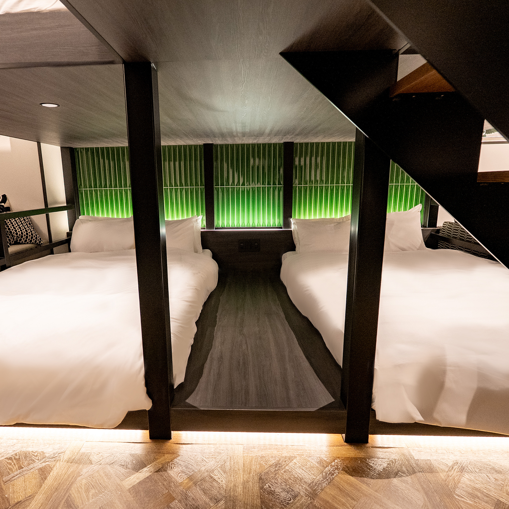 ベッドはダブルが4つ。階段が横にあるタイプのお部屋で、寝相が悪くても安心です。