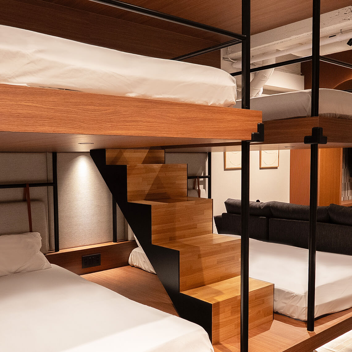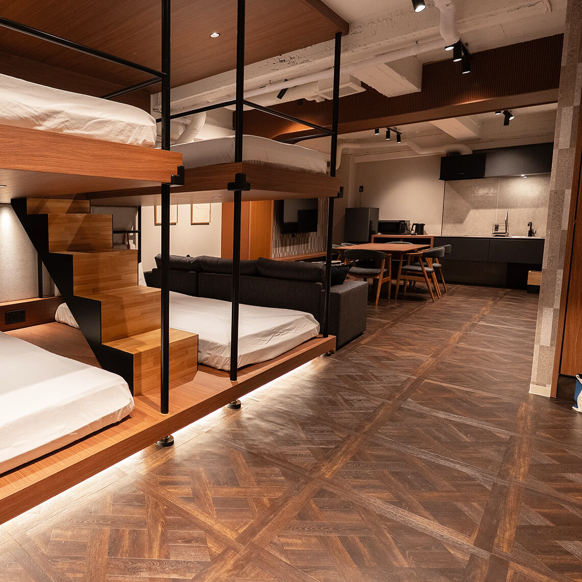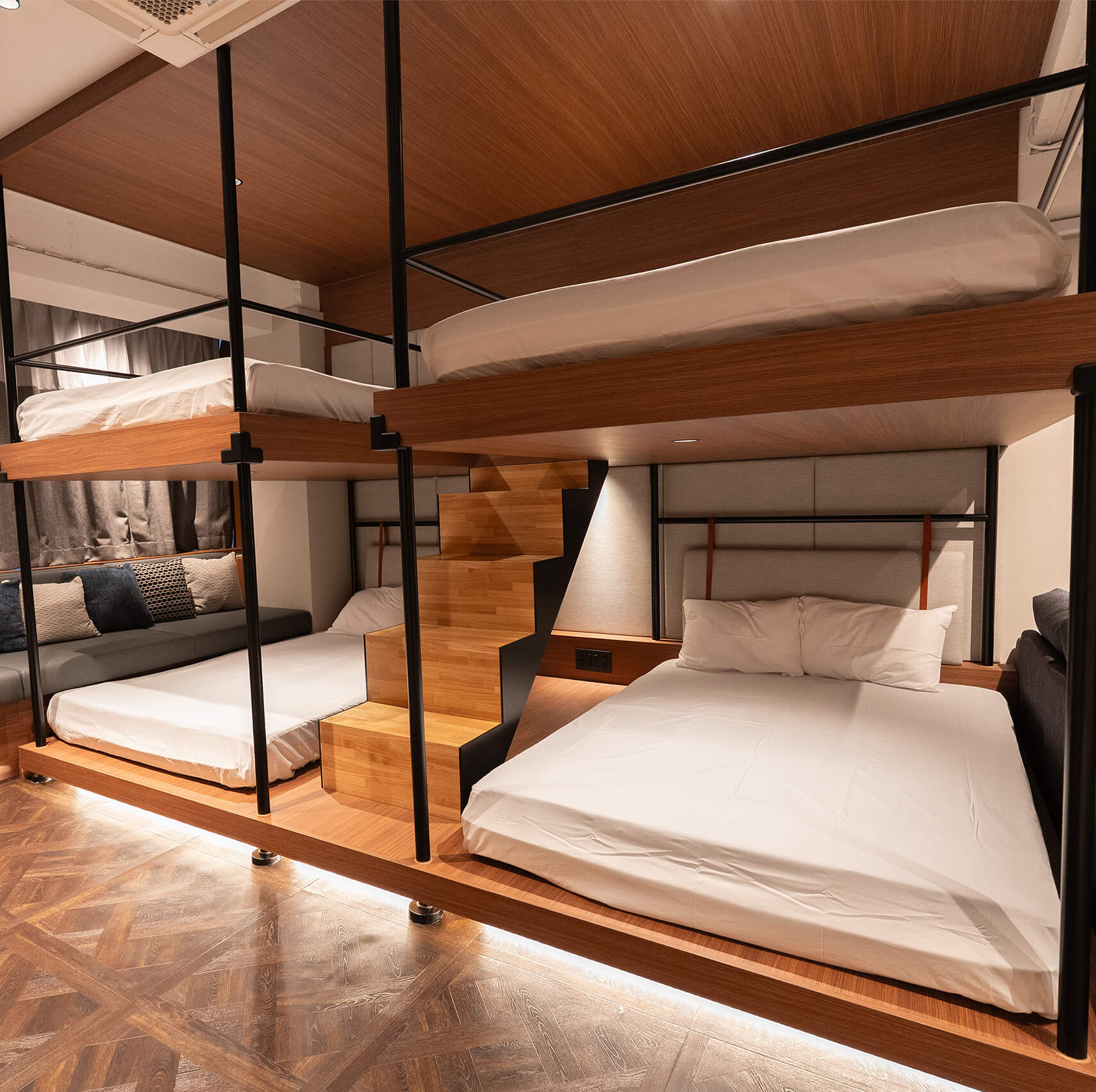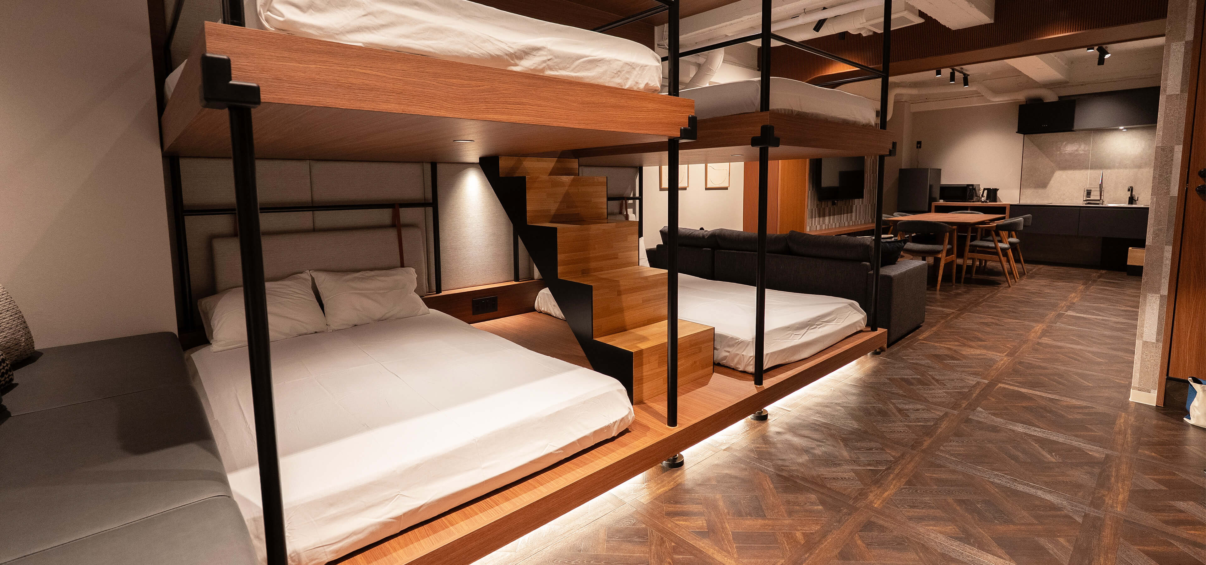 ベッドはダブルが4つ。階段が横にあるタイプのお部屋で、寝相が悪くても安心です。