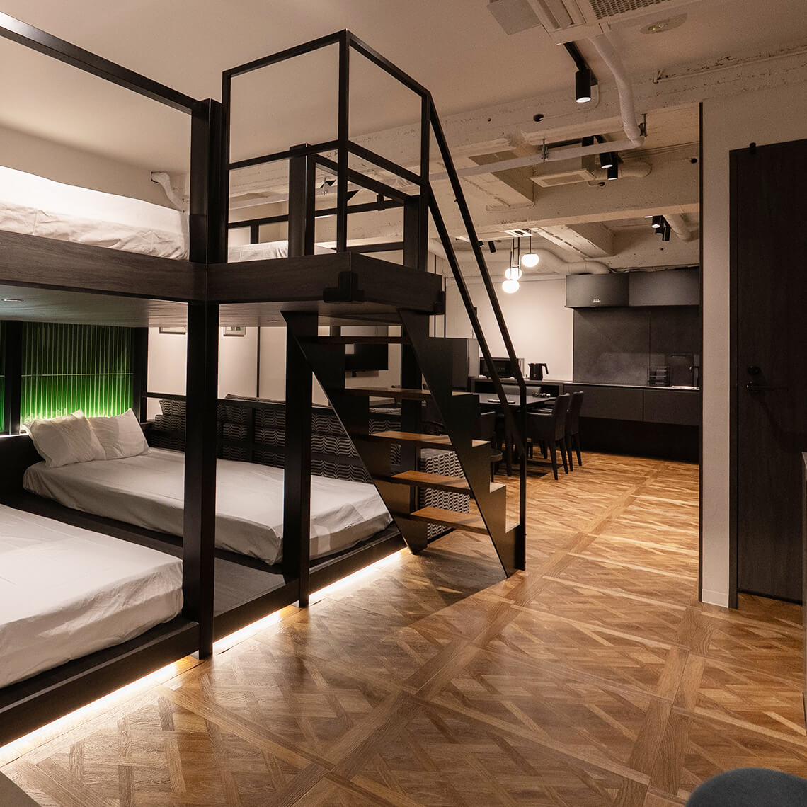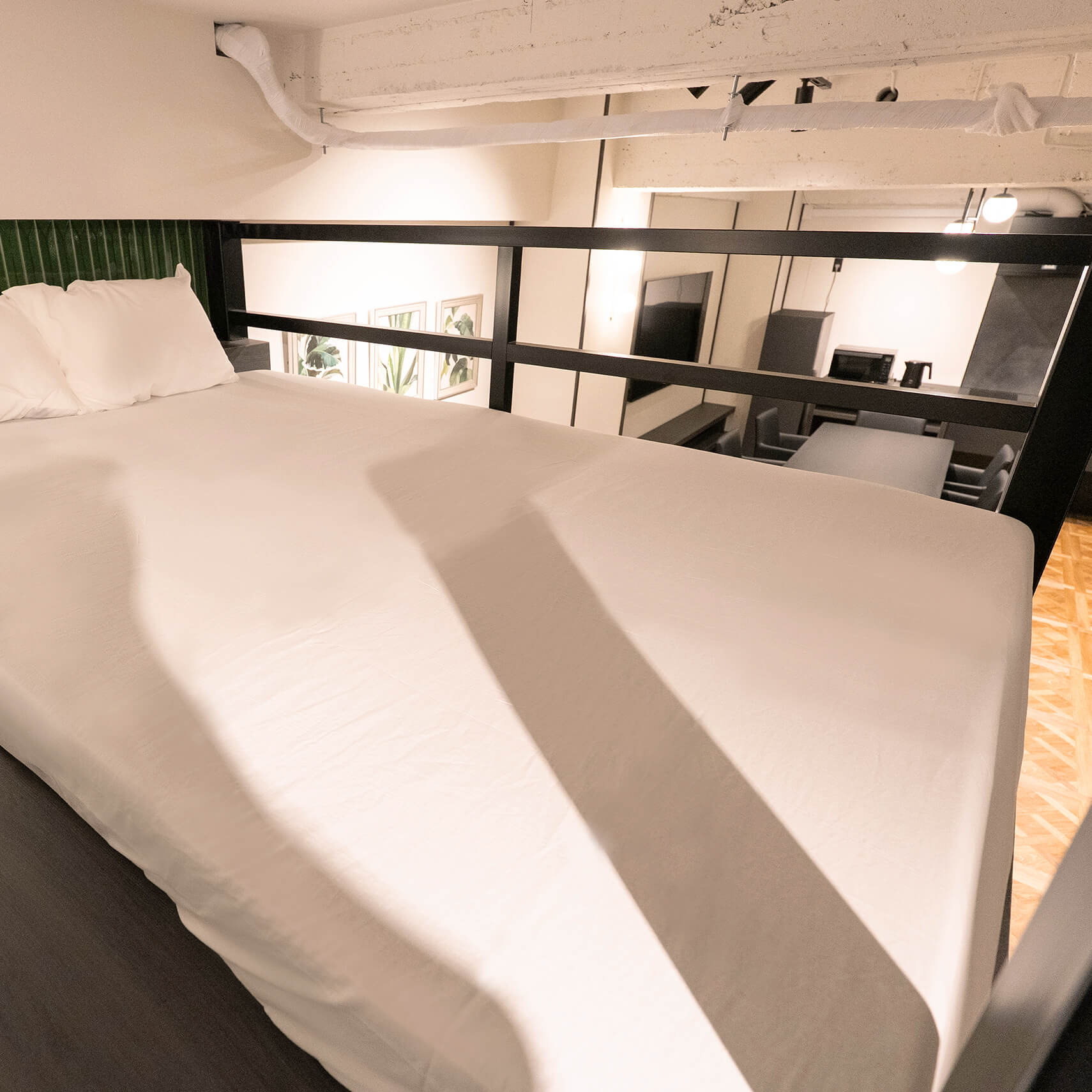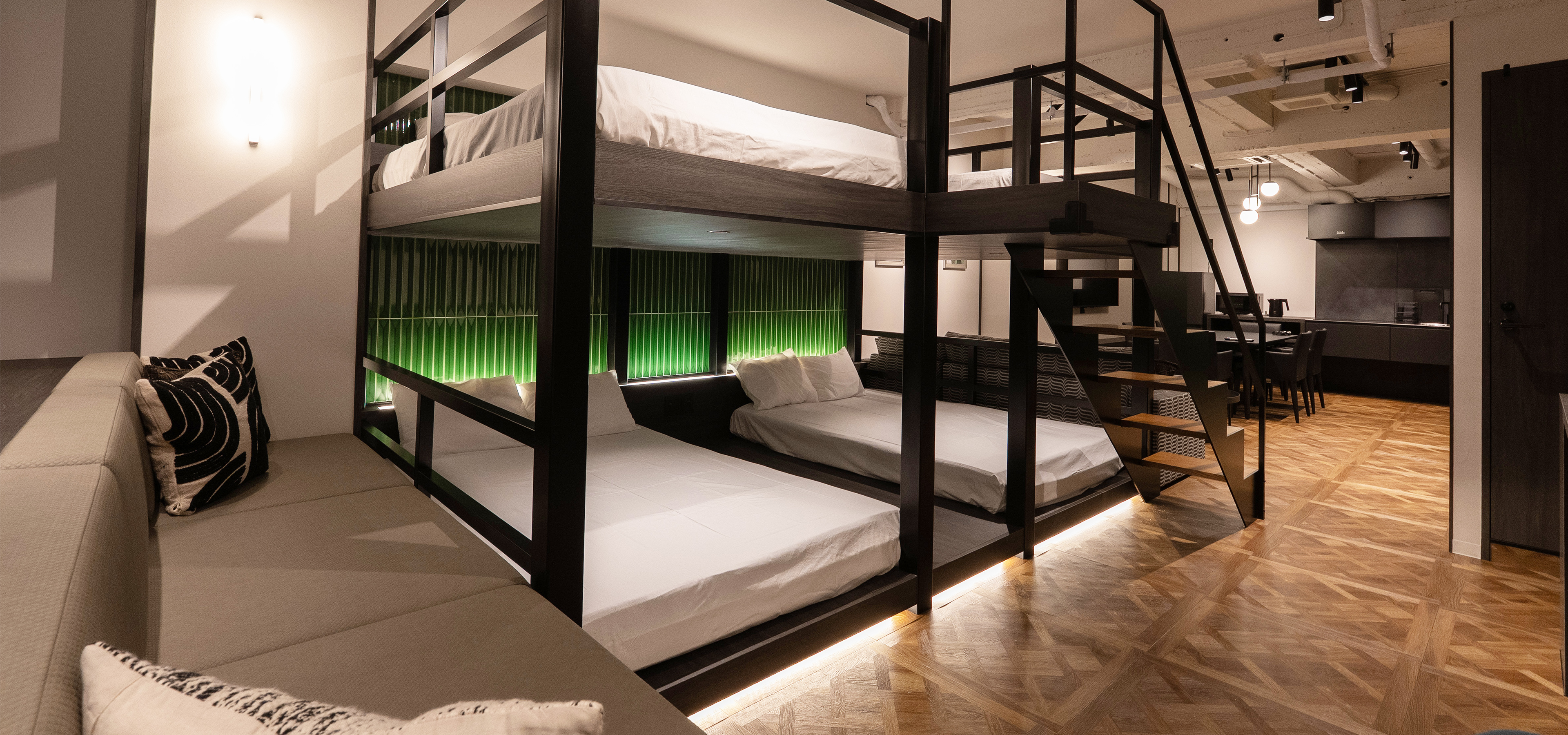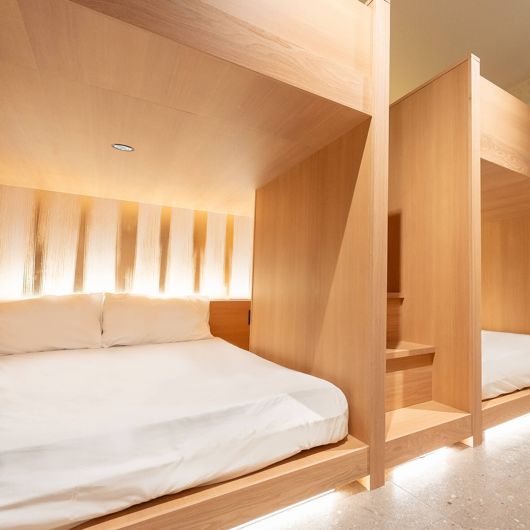 ベッドはダブルが4つ。階段が横にあるタイプのお部屋で、寝相が悪くても安心です。