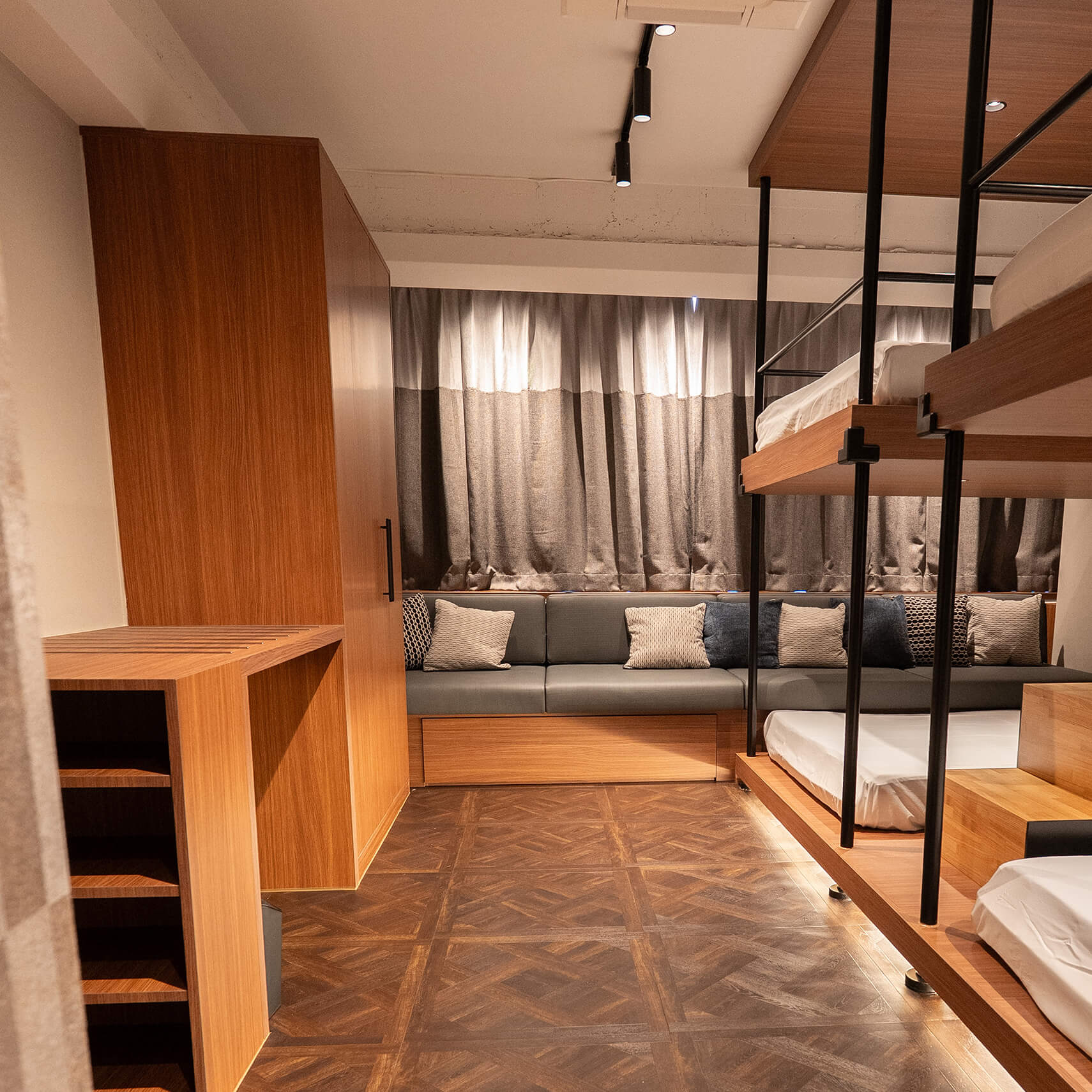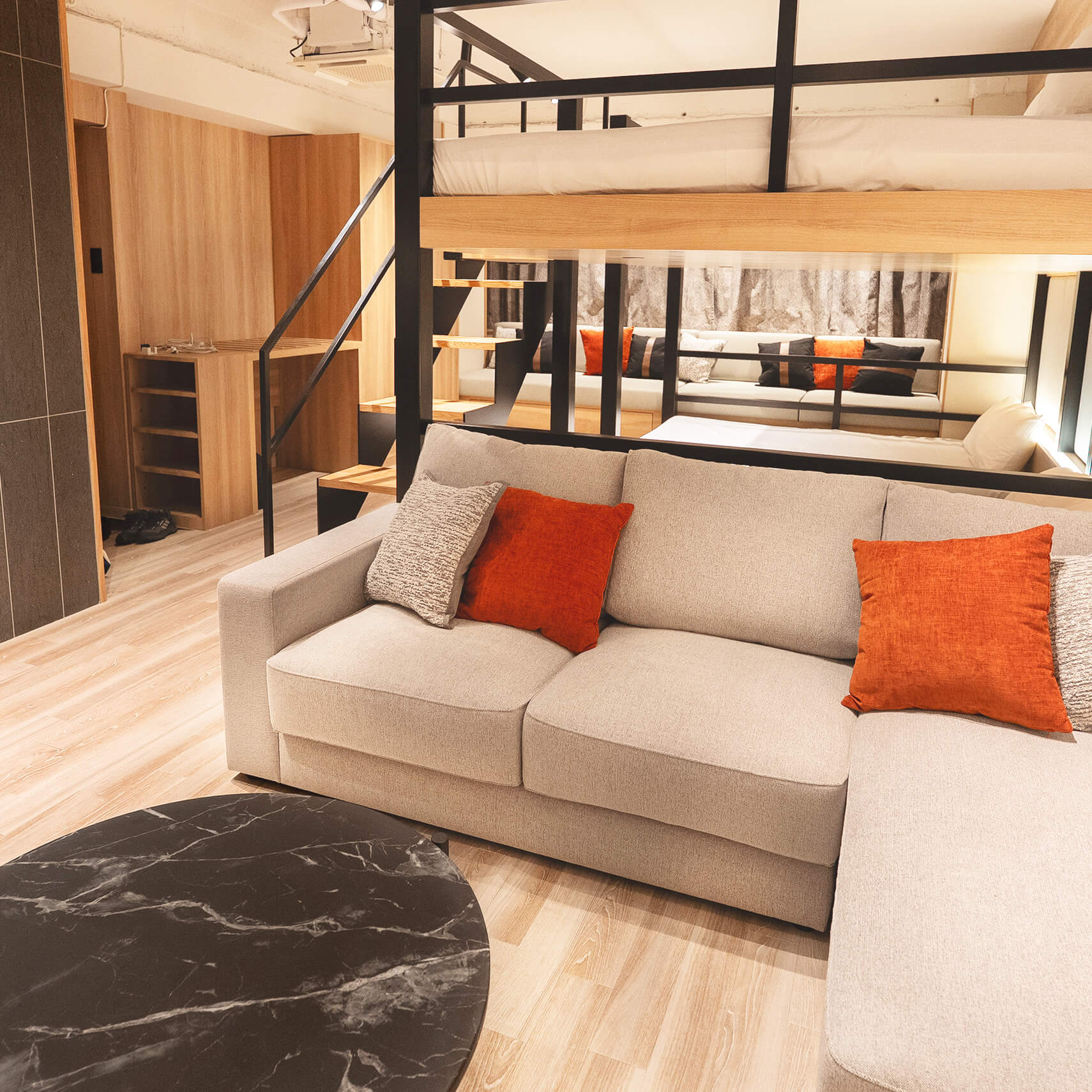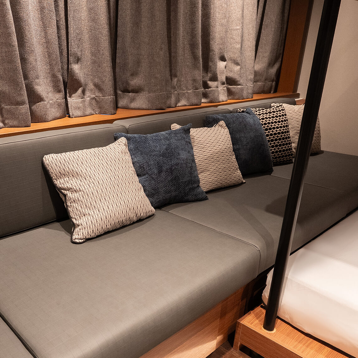 ベットの両脇にはソファーとクッションがあり、大人数でもゆったりと寛げます。