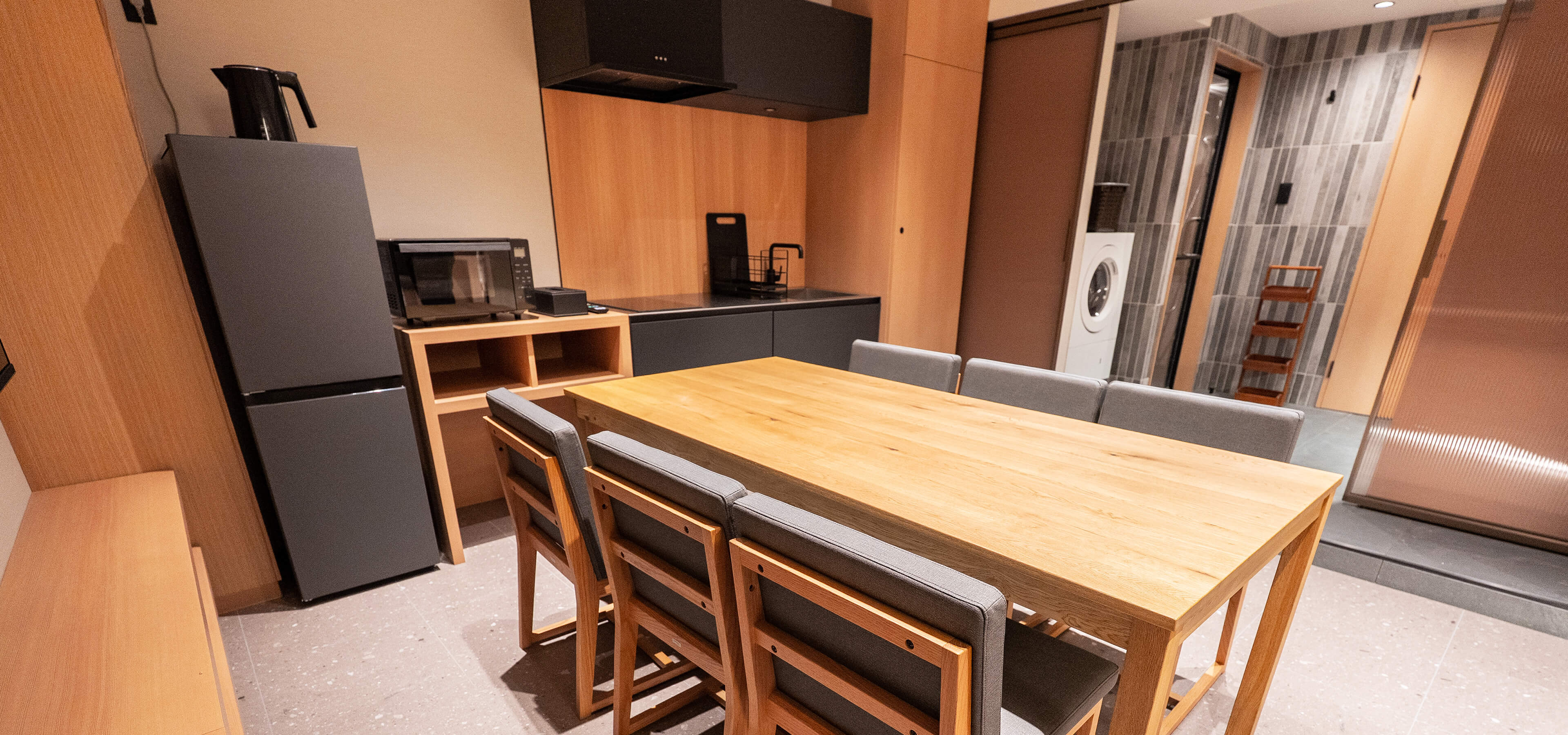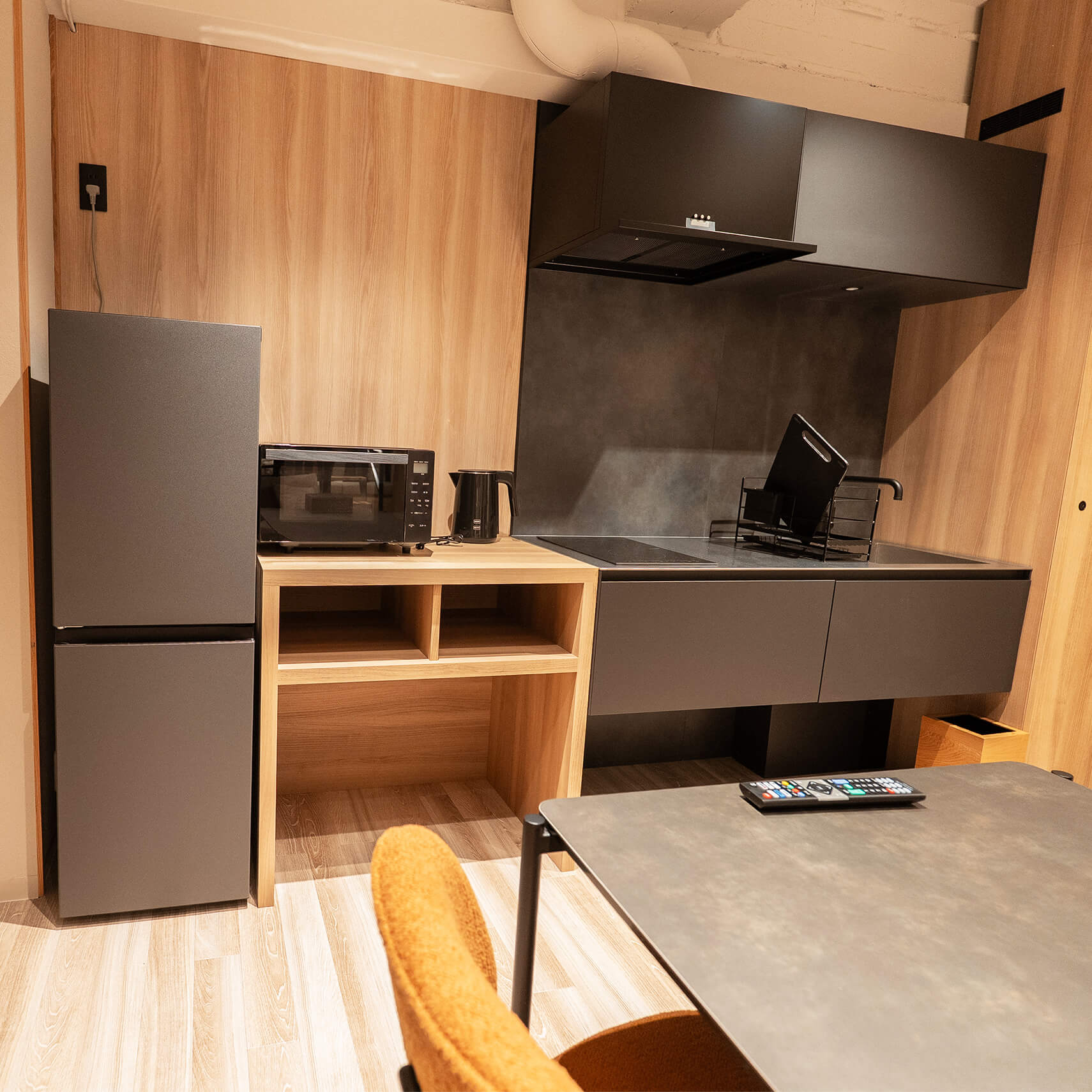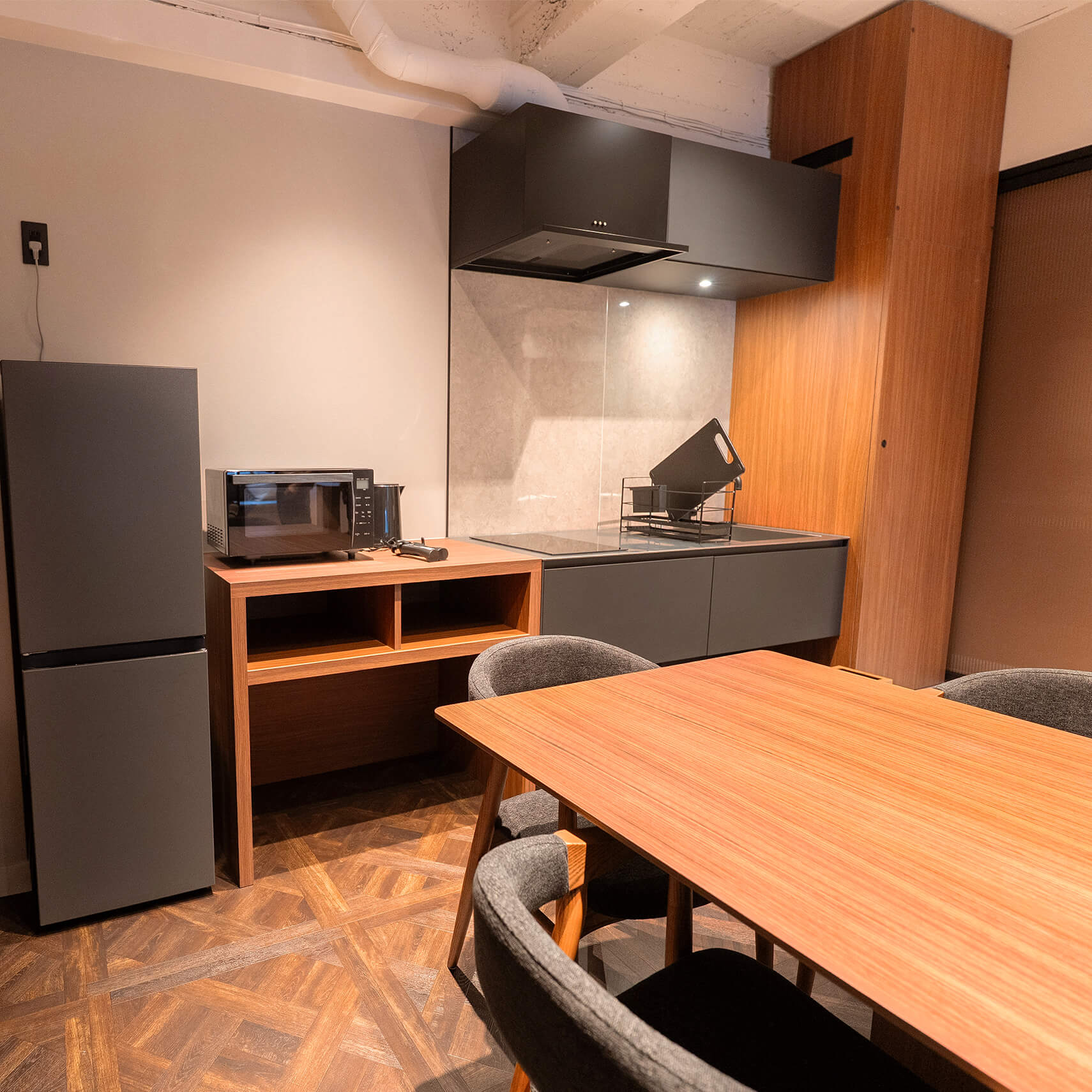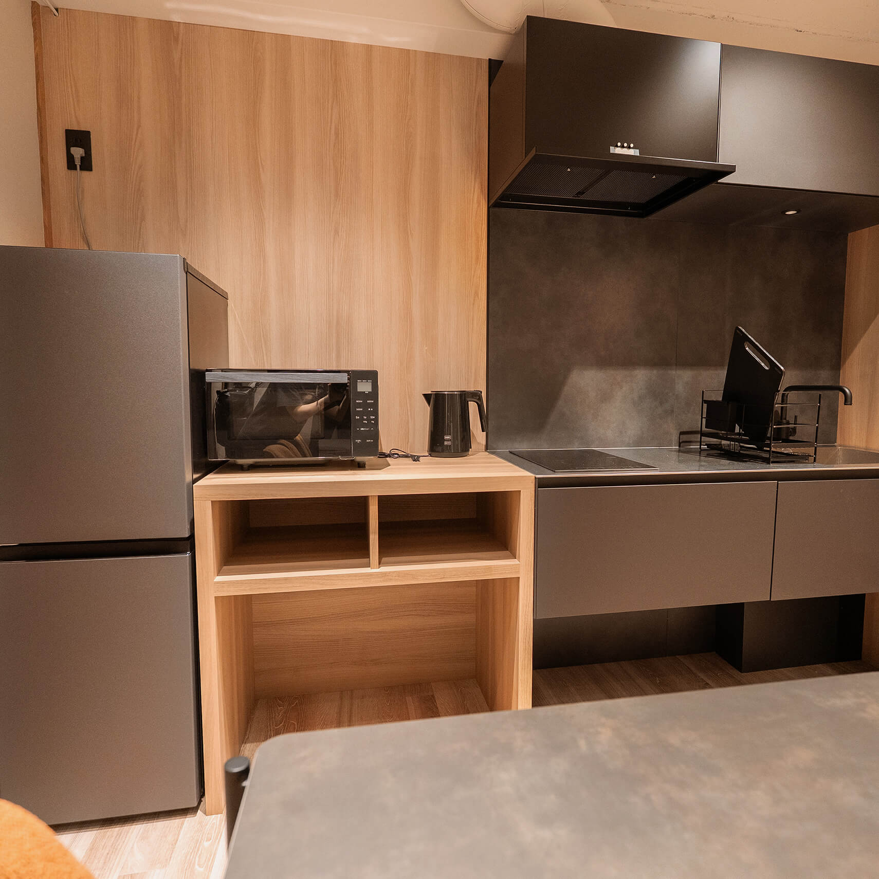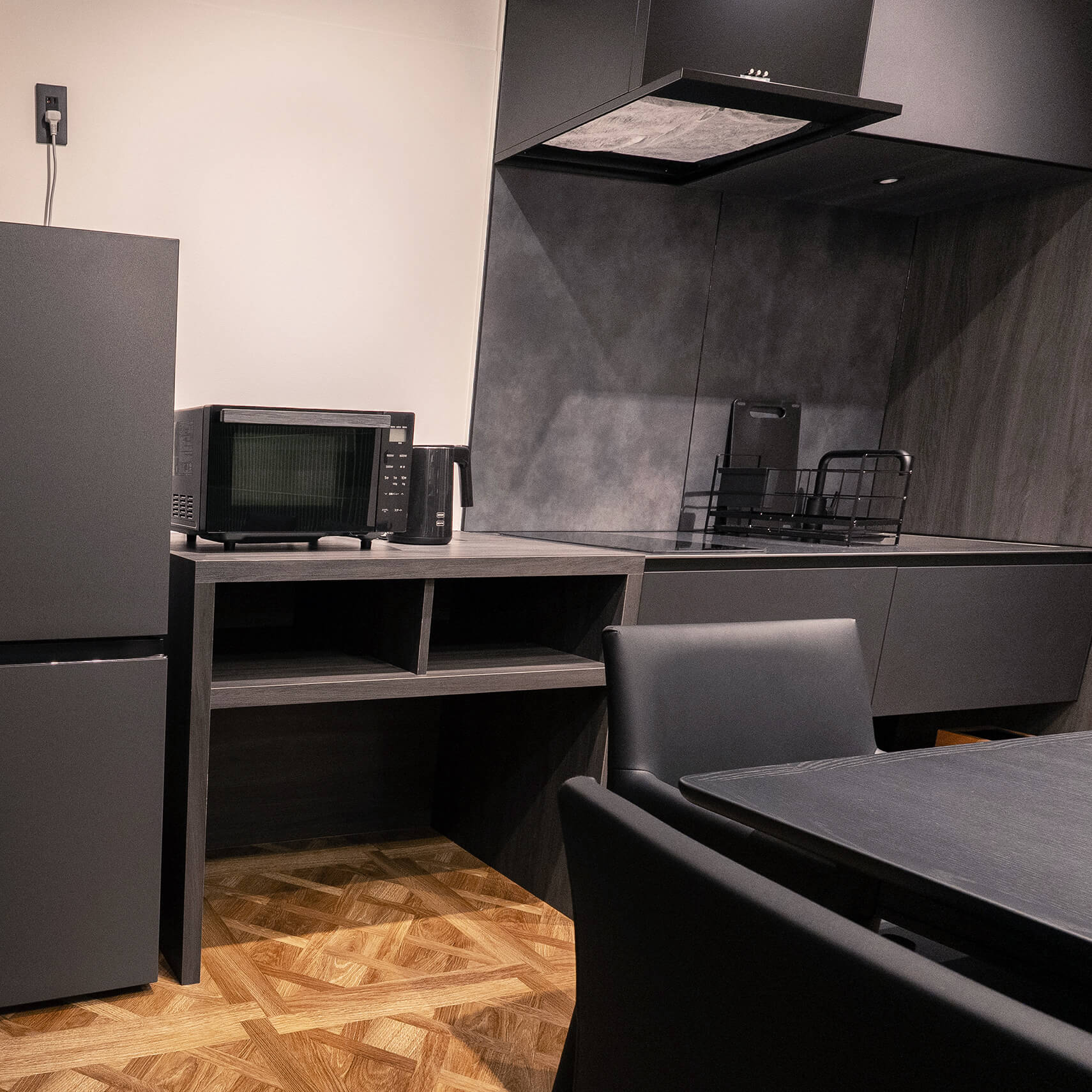 キッチン周りは黒を基調とし、IHコンロ、冷蔵庫、電子レンジ等配備し、長期滞在も安心。