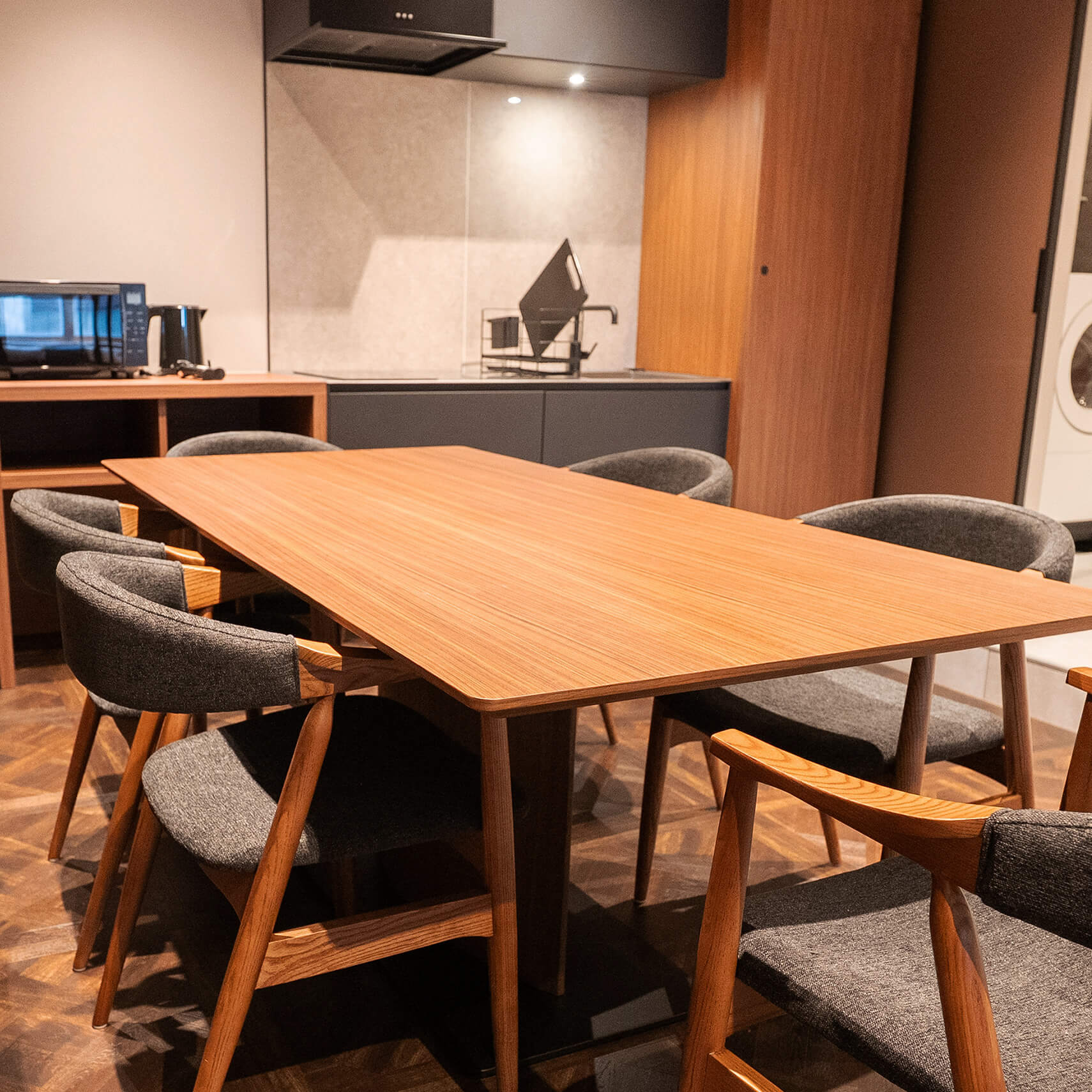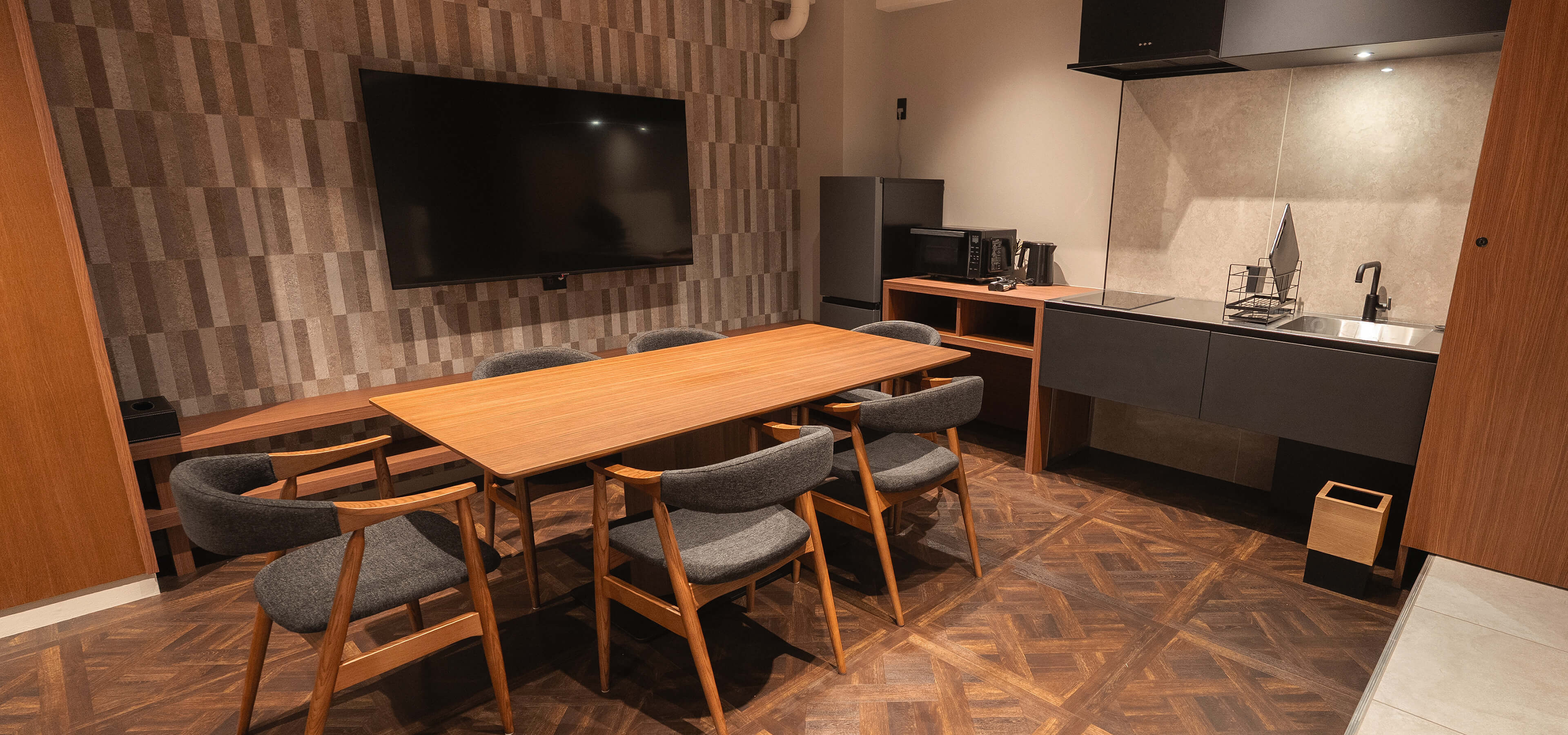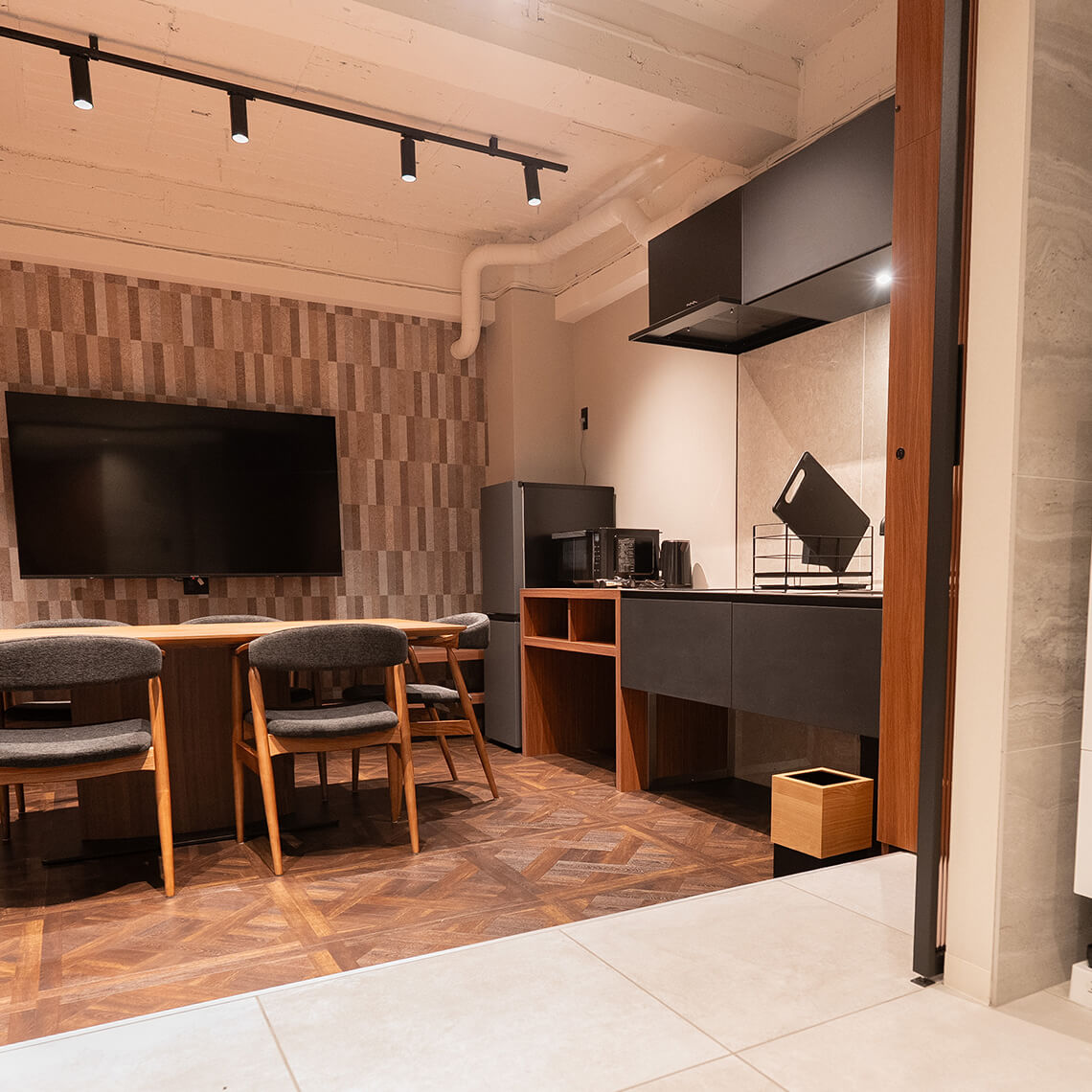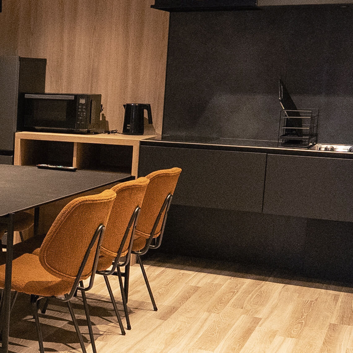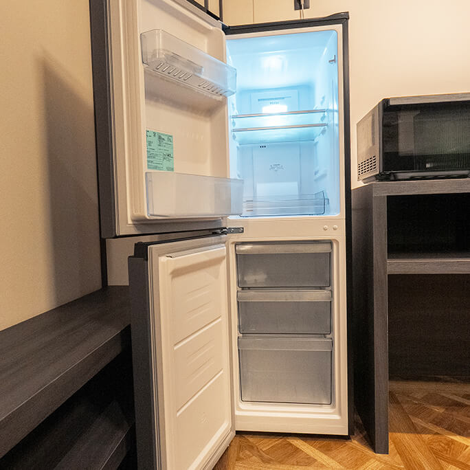 キッチン周りは黒を基調とし、IHコンロ、冷蔵庫、電子レンジ等配備し、長期滞在も安心。