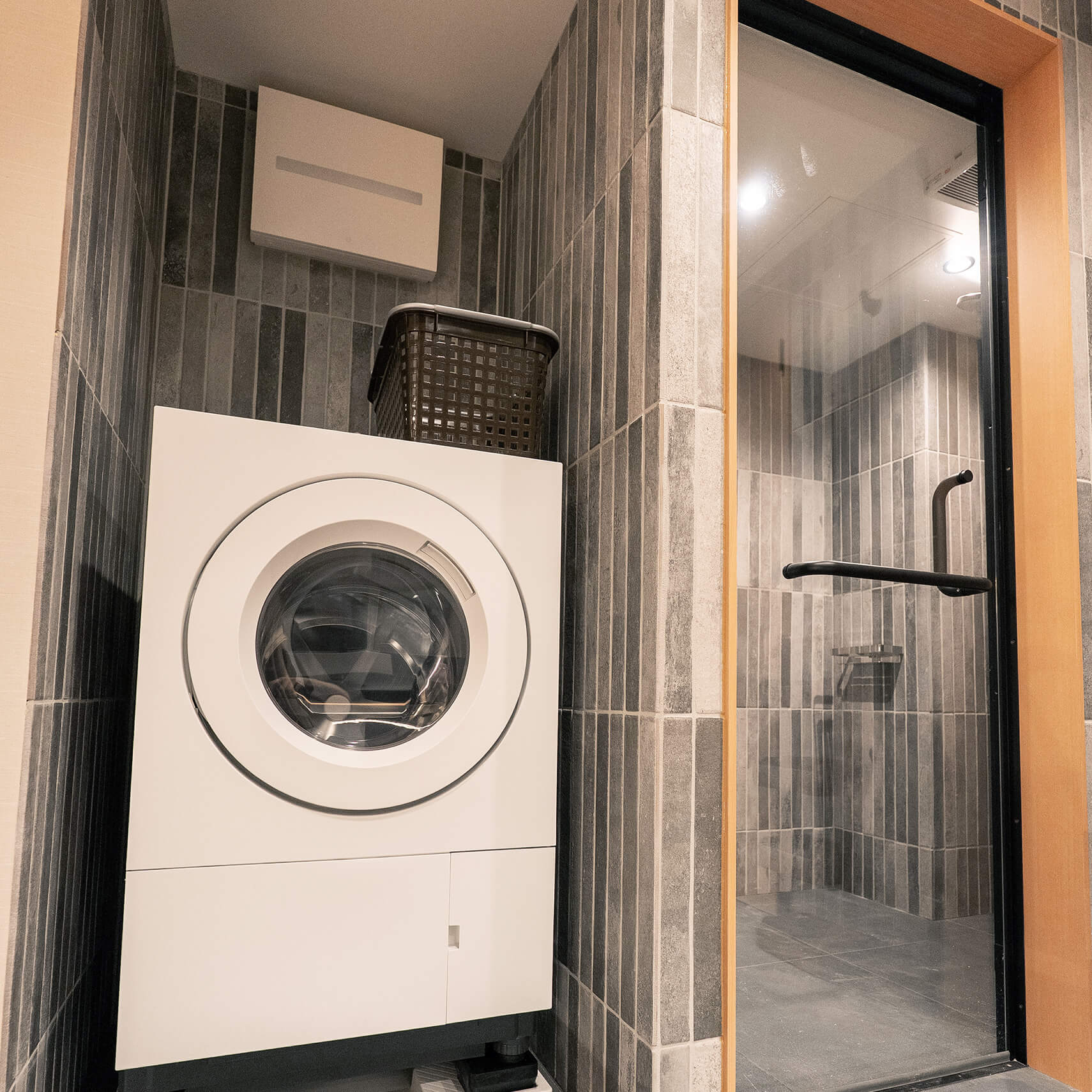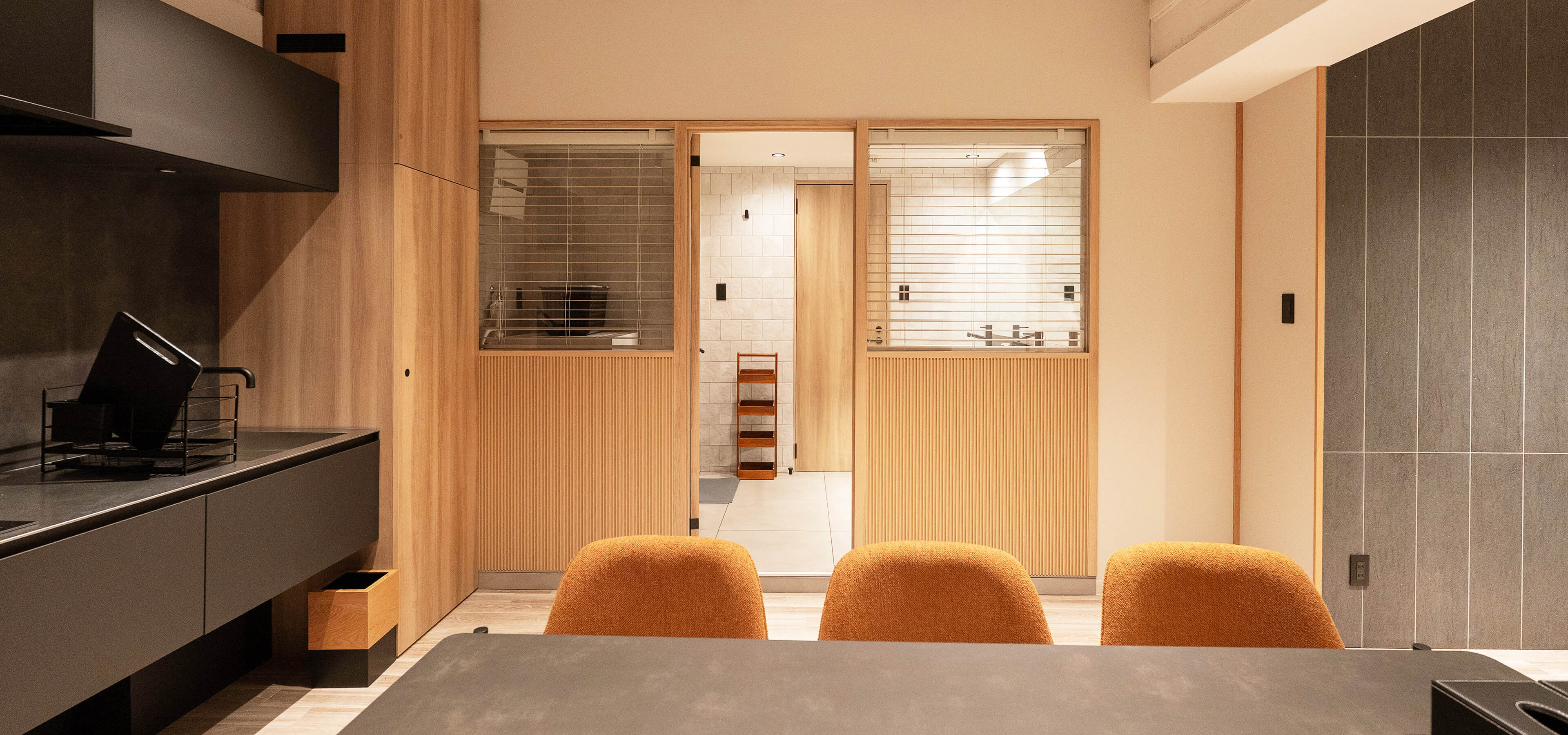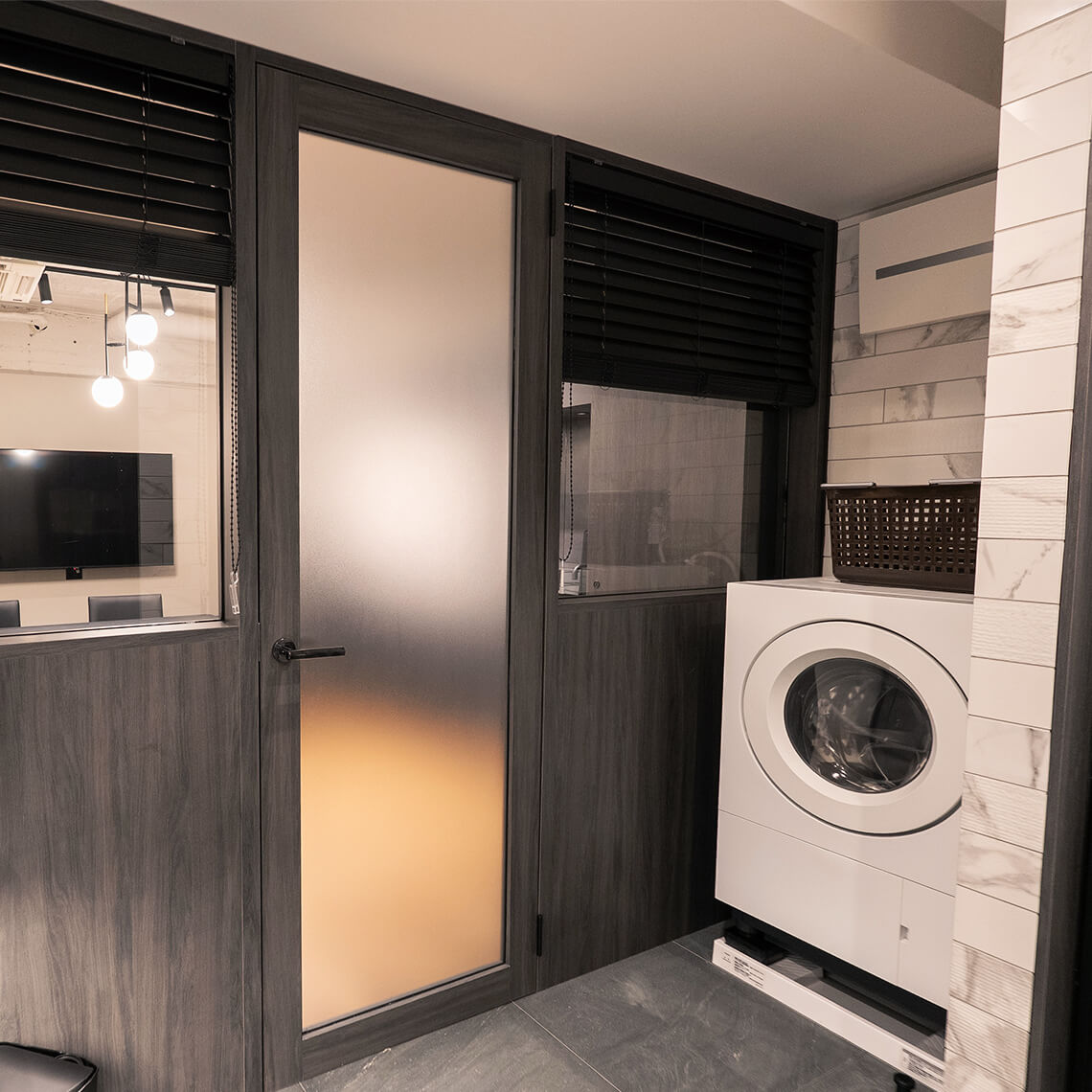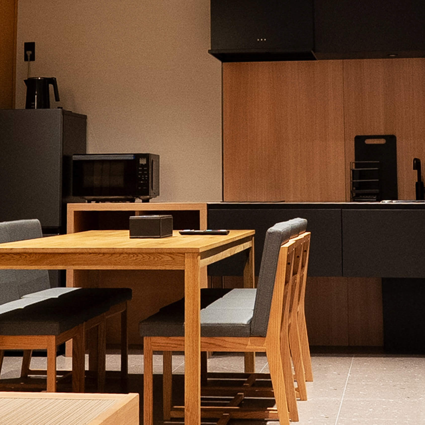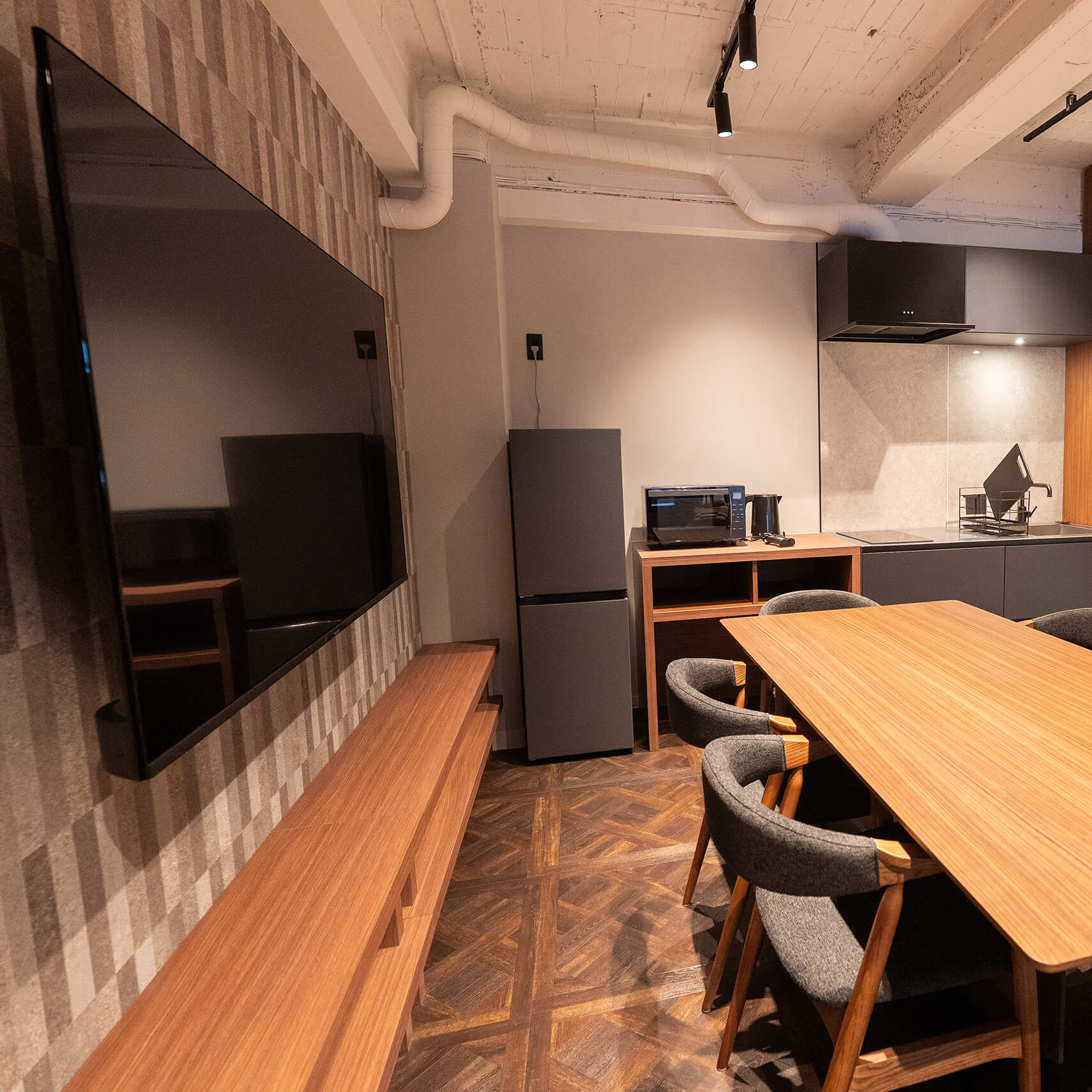 キッチン周りは黒を基調とし、IHコンロ、冷蔵庫、電子レンジ等配備し、長期滞在も安心。