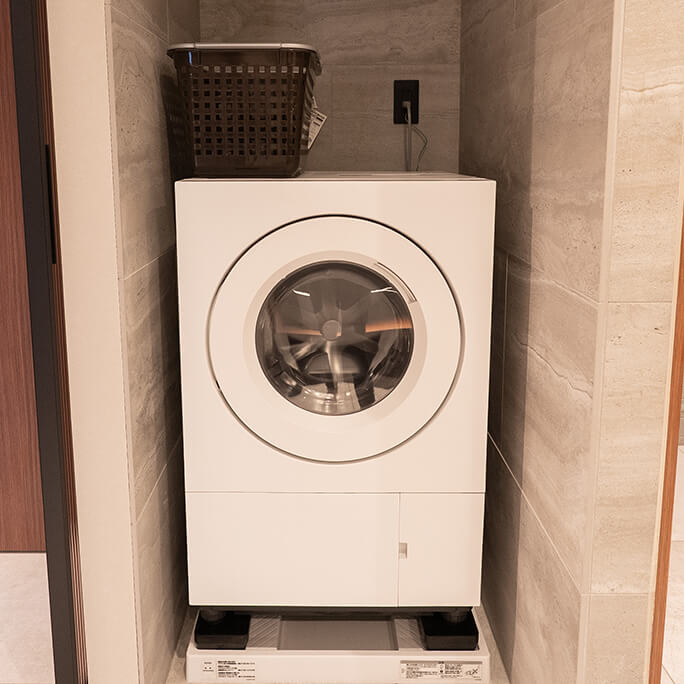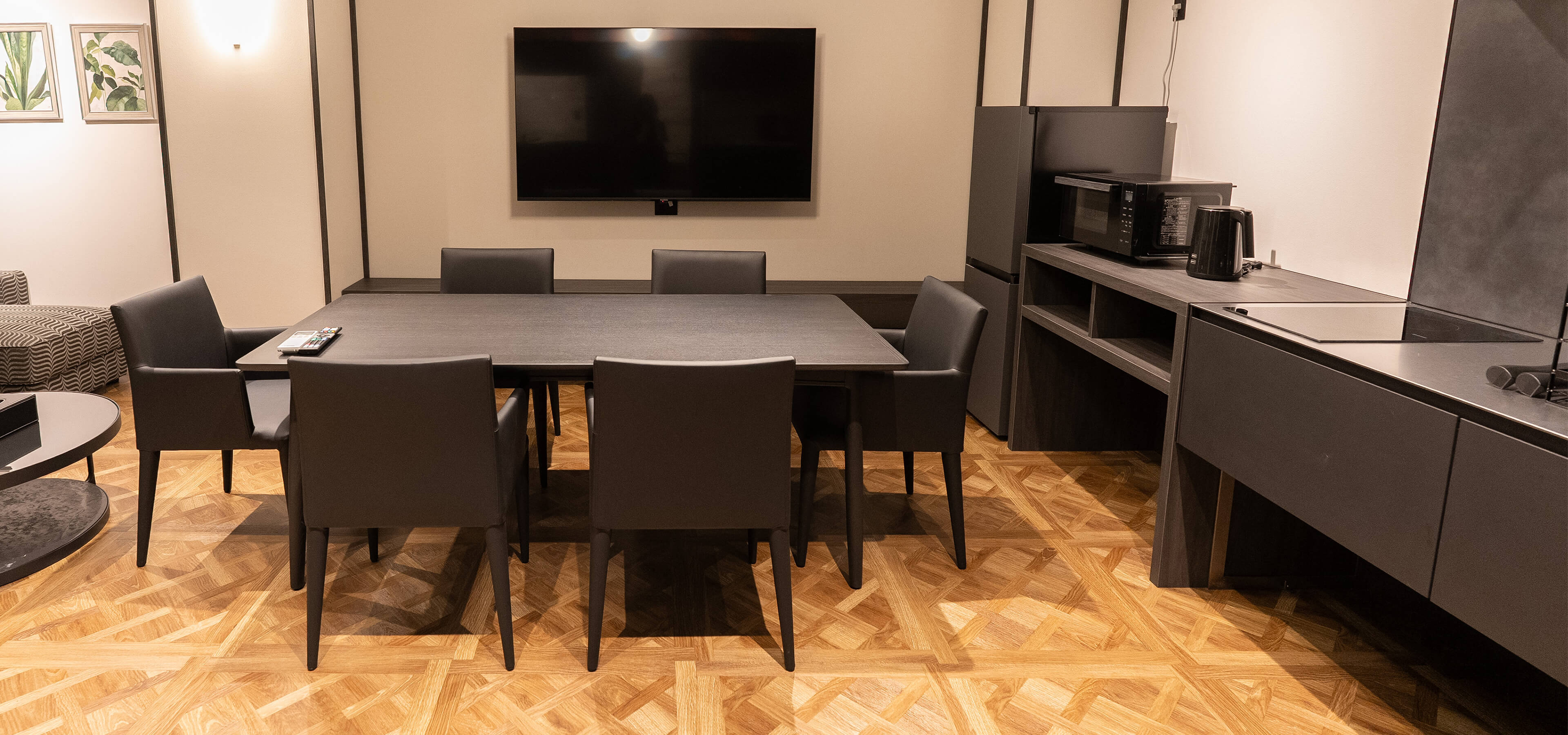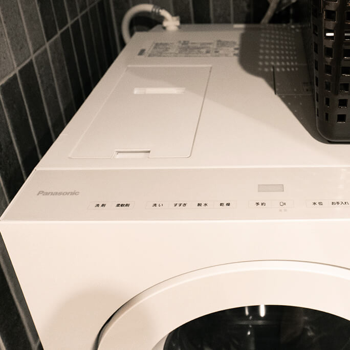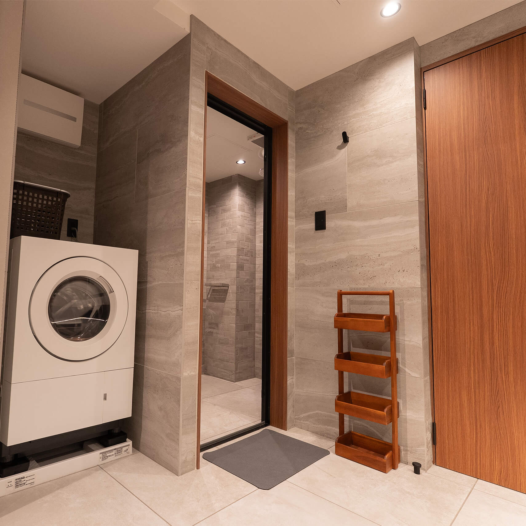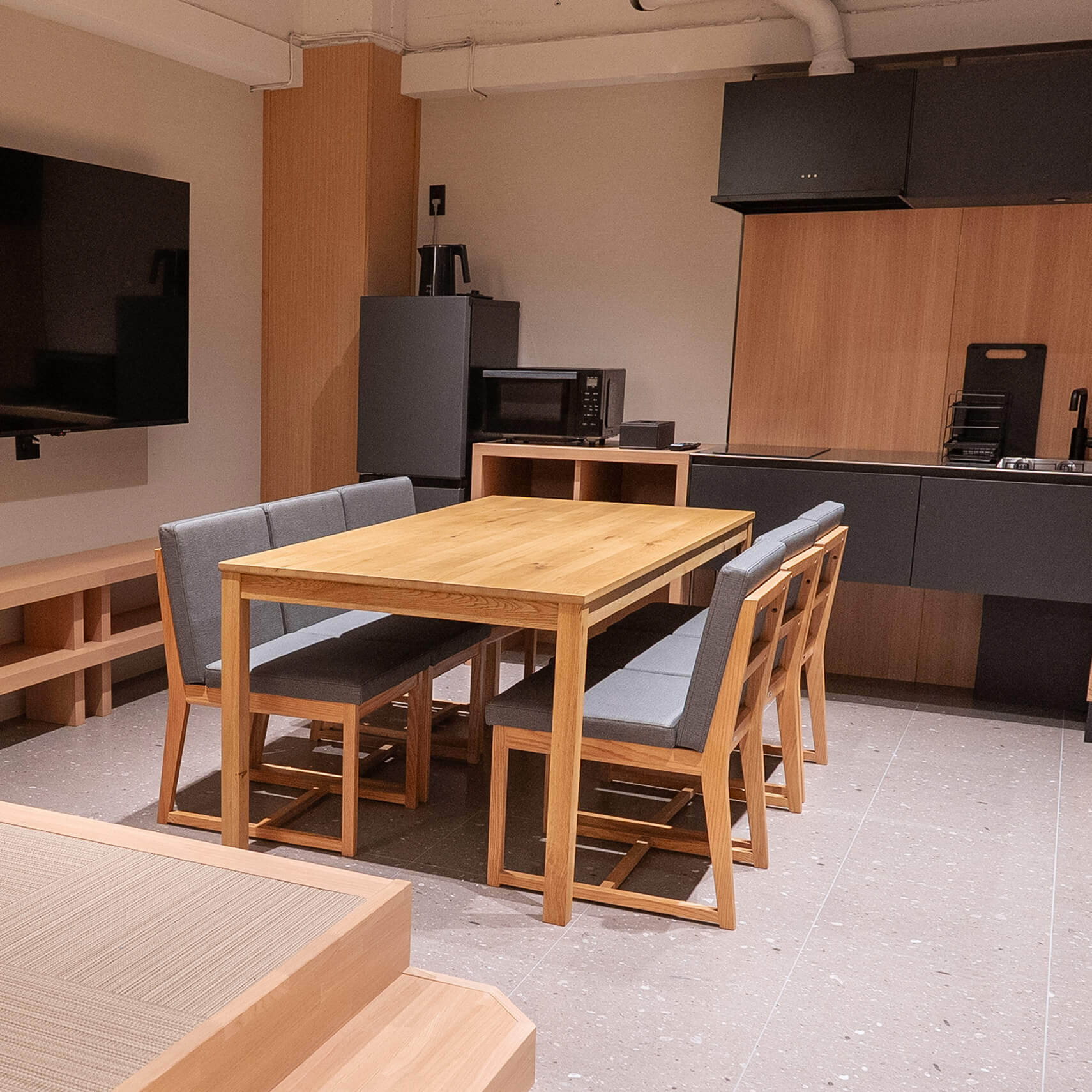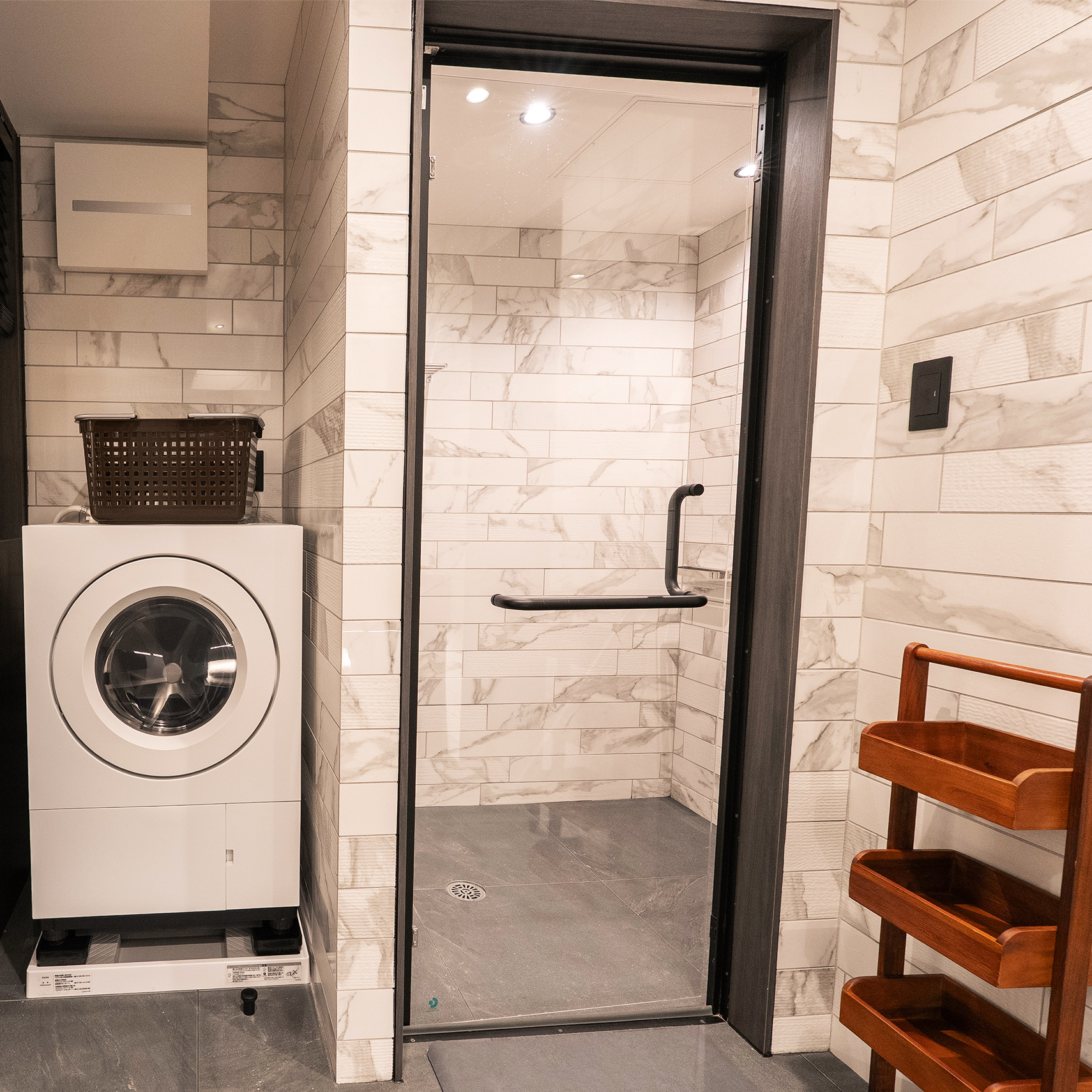 キッチン周りは黒を基調とし、IHコンロ、冷蔵庫、電子レンジ等配備し、長期滞在も安心。