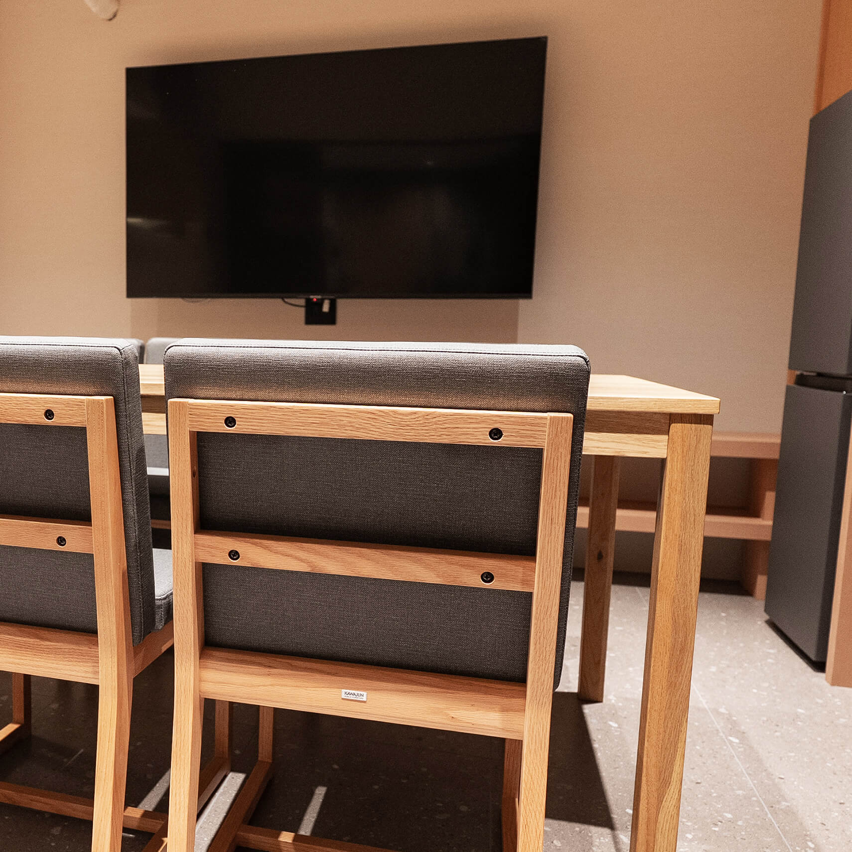 リビングの椅子は手すり付きタイプで子どもやお年を召した方も安心。