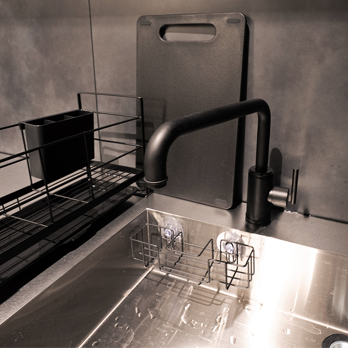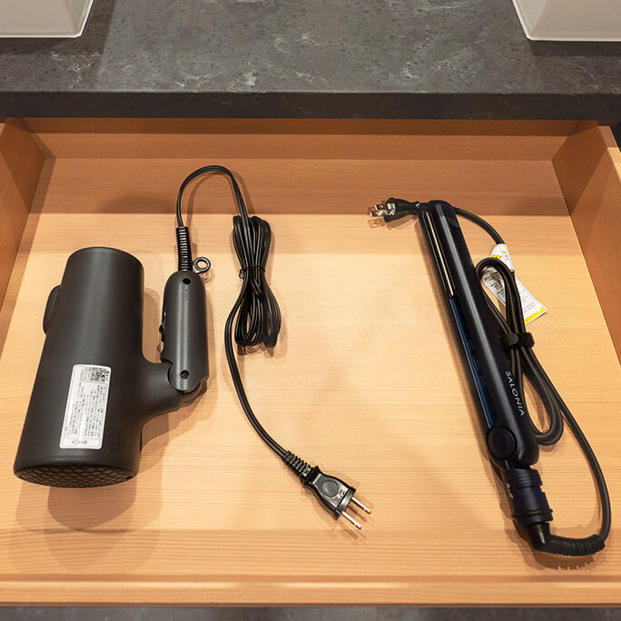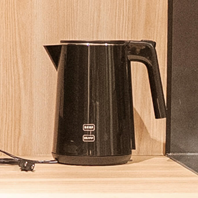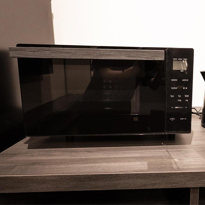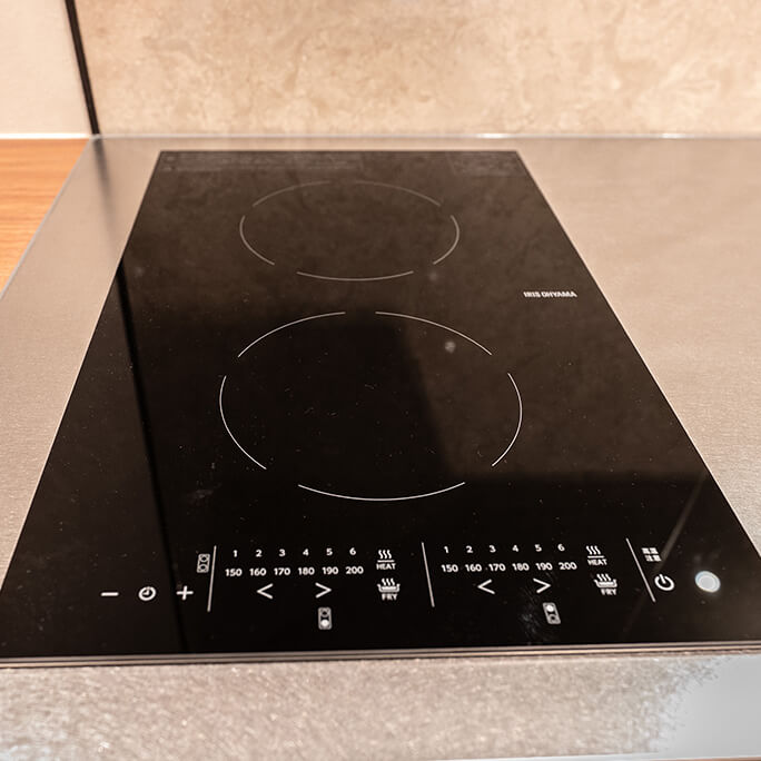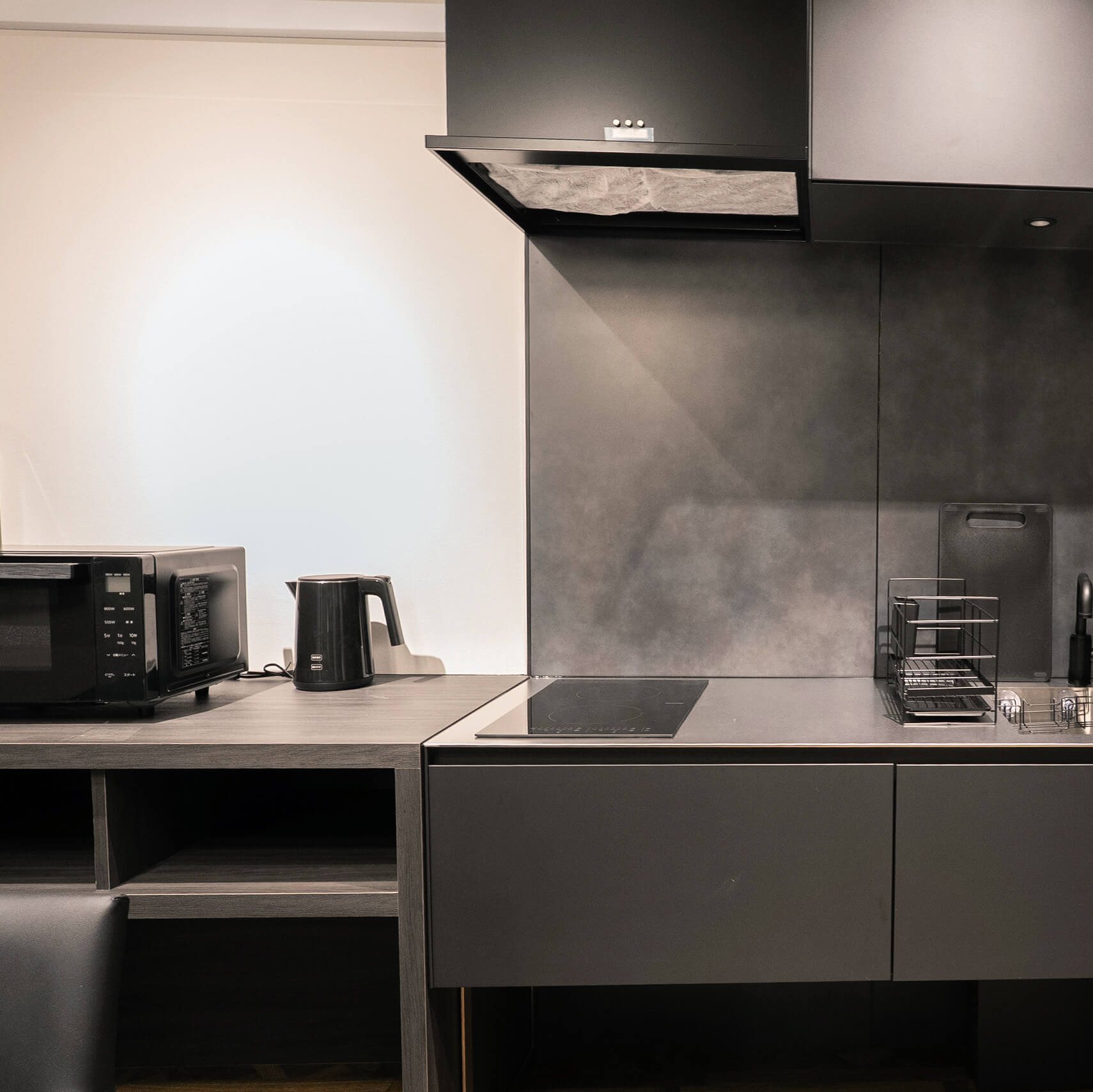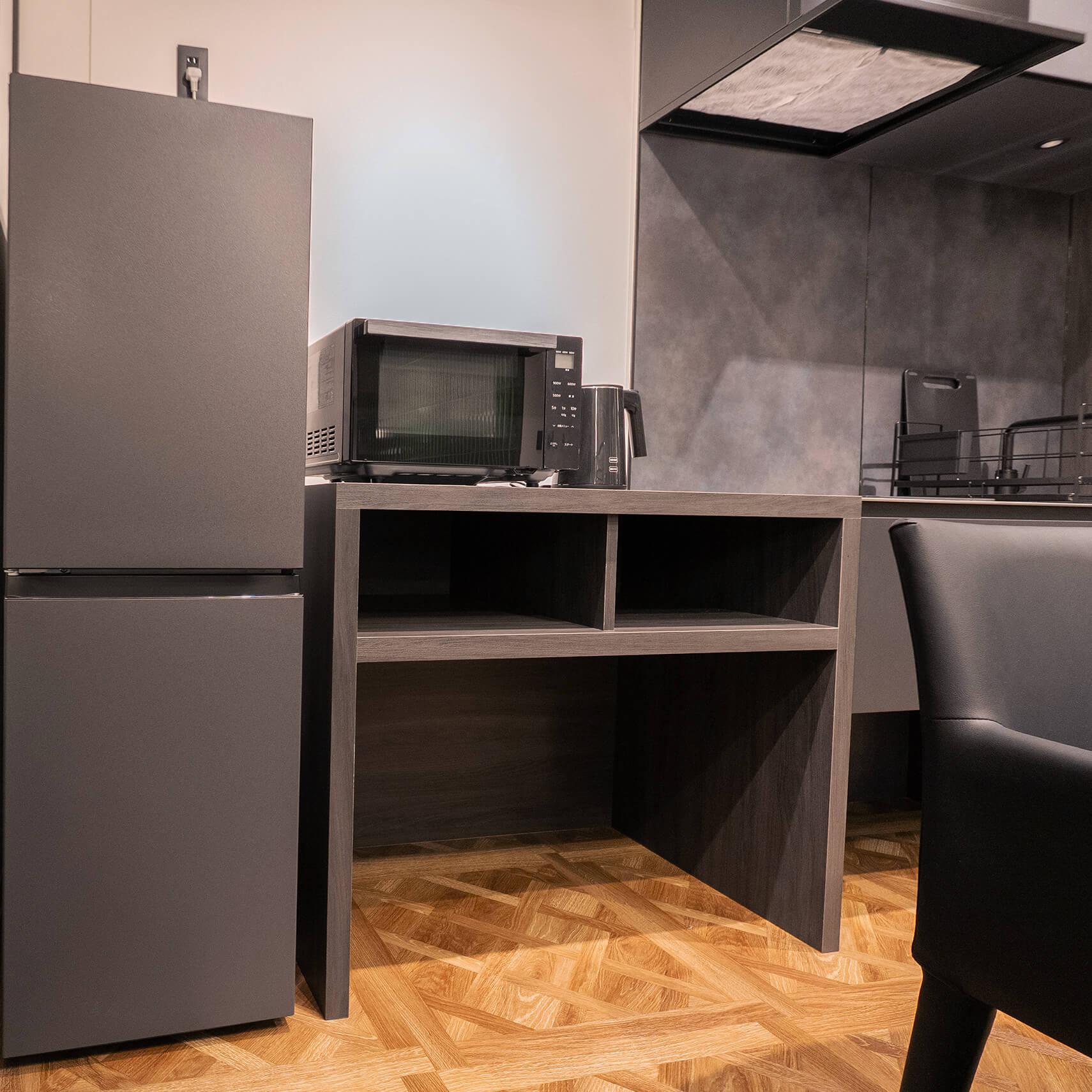 キッチン周りは黒を基調とし、IHコンロ、冷蔵庫、電子レンジ等配備。備品も黒で統一したスッキリしたデザイン。