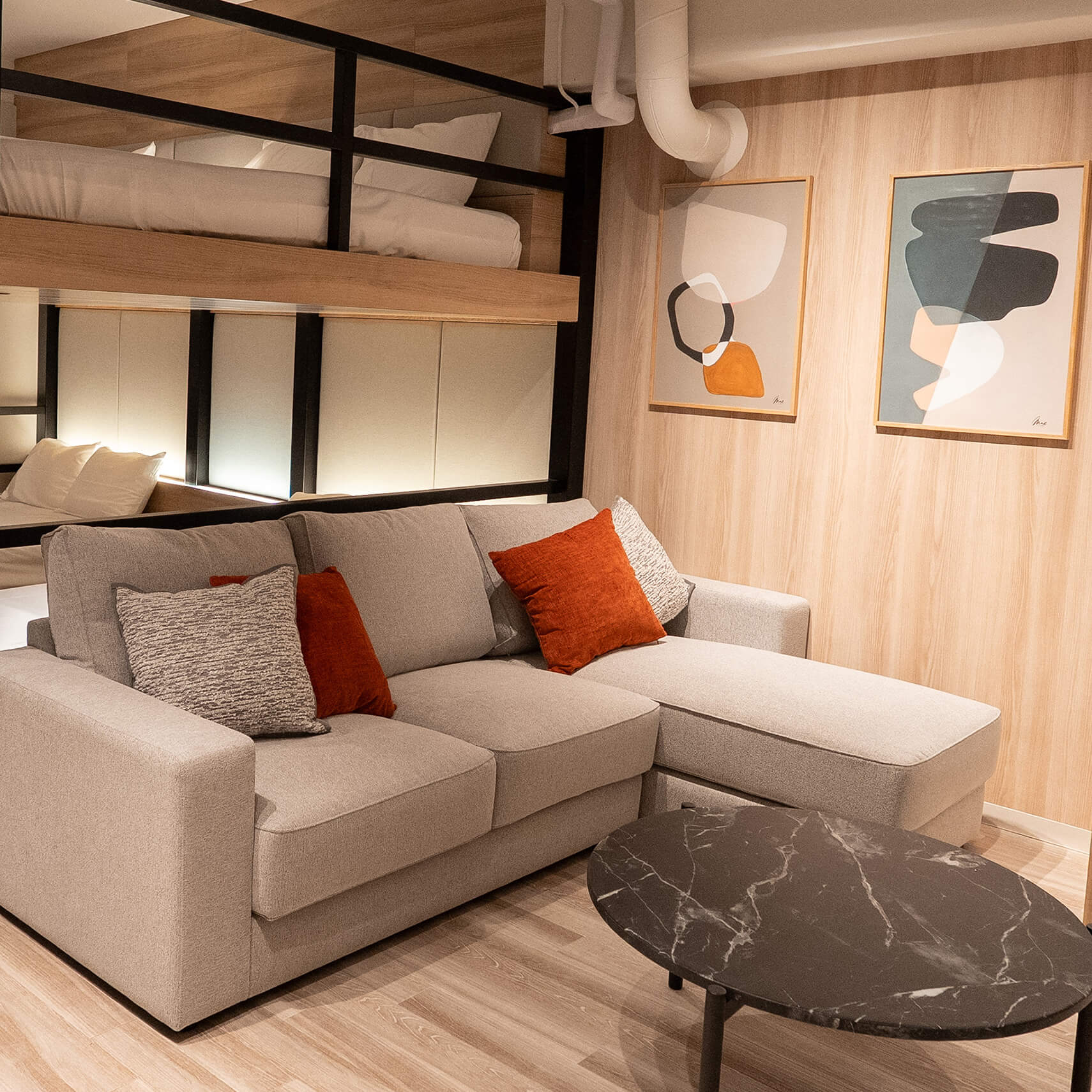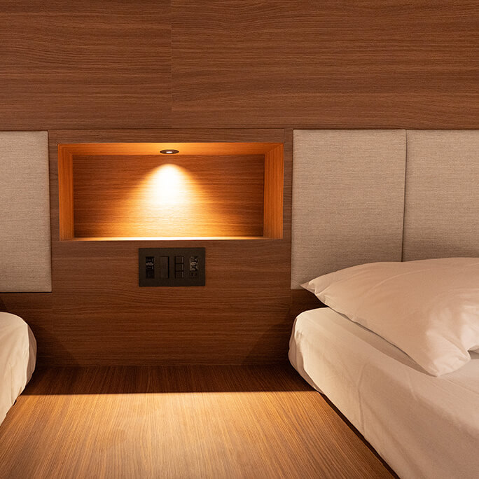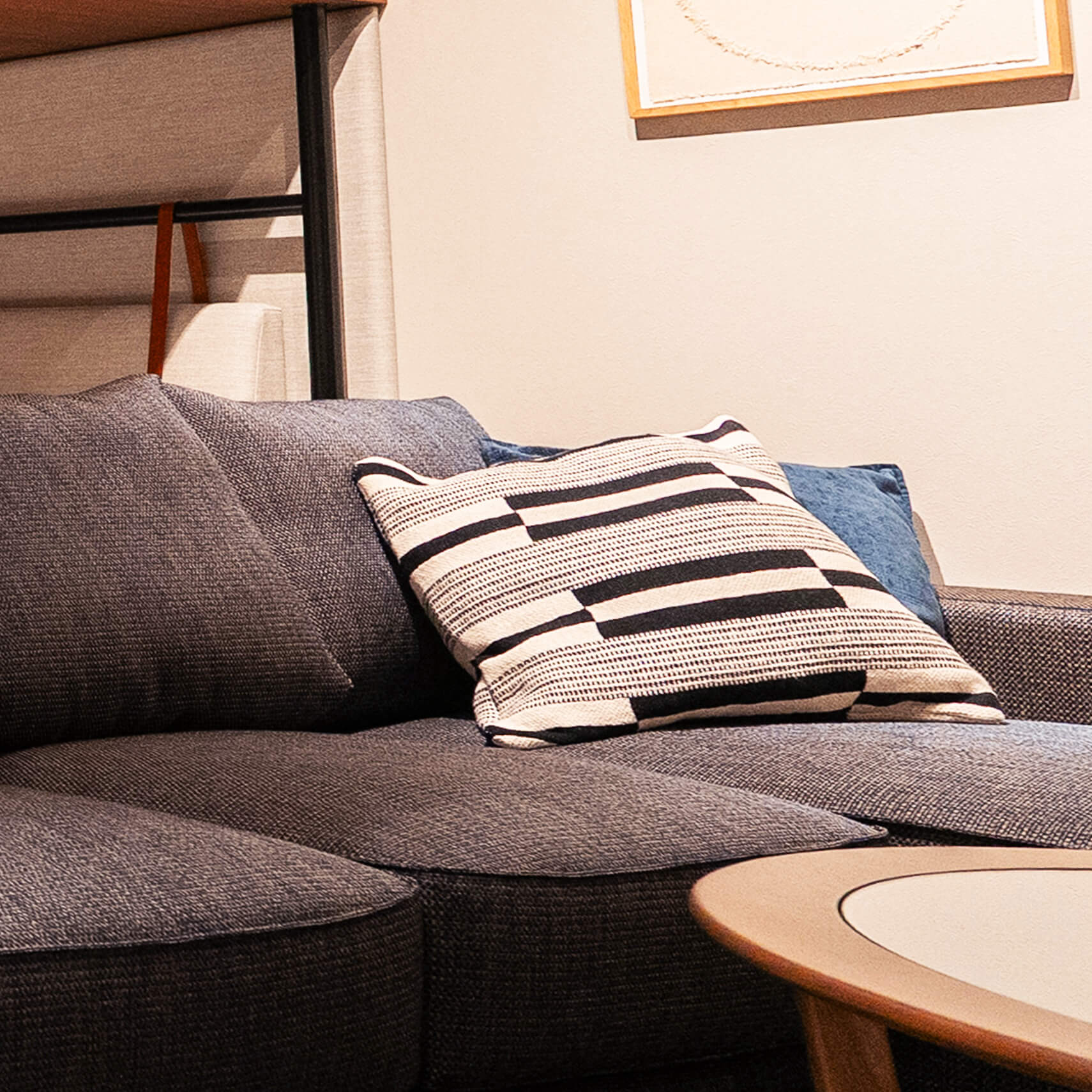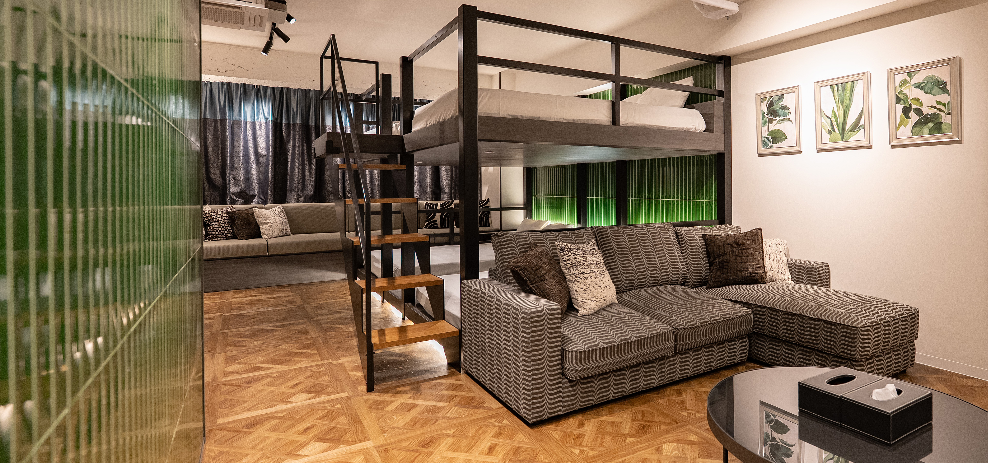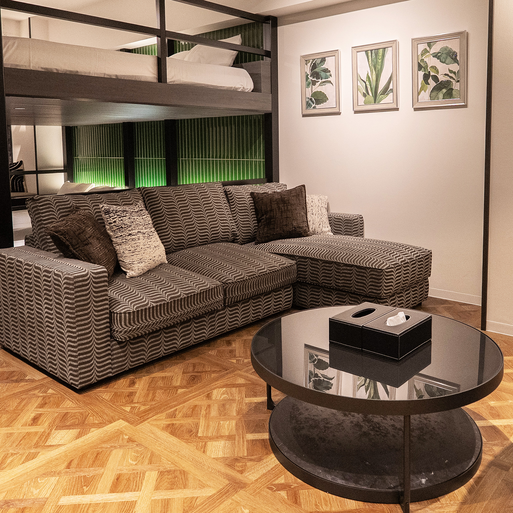 黒とブラウンを基調としたベッドやソファーは落ち着いた雰囲気で、自分の家のようにゆっくり過ごせます。