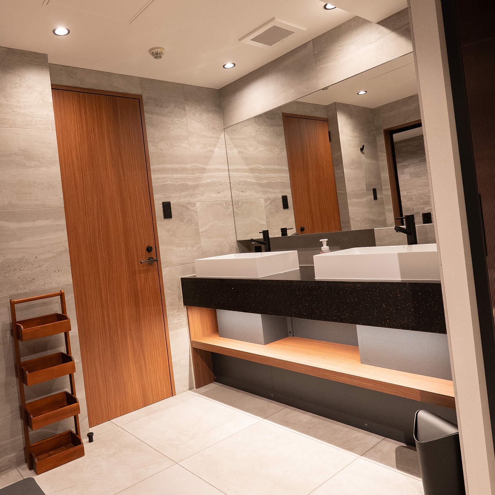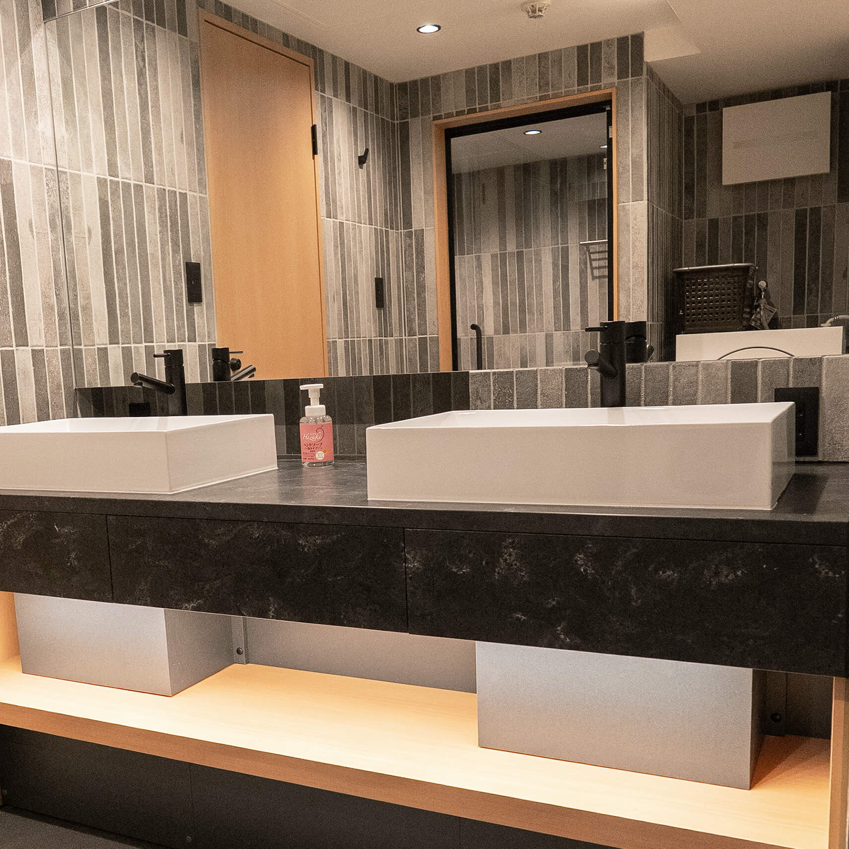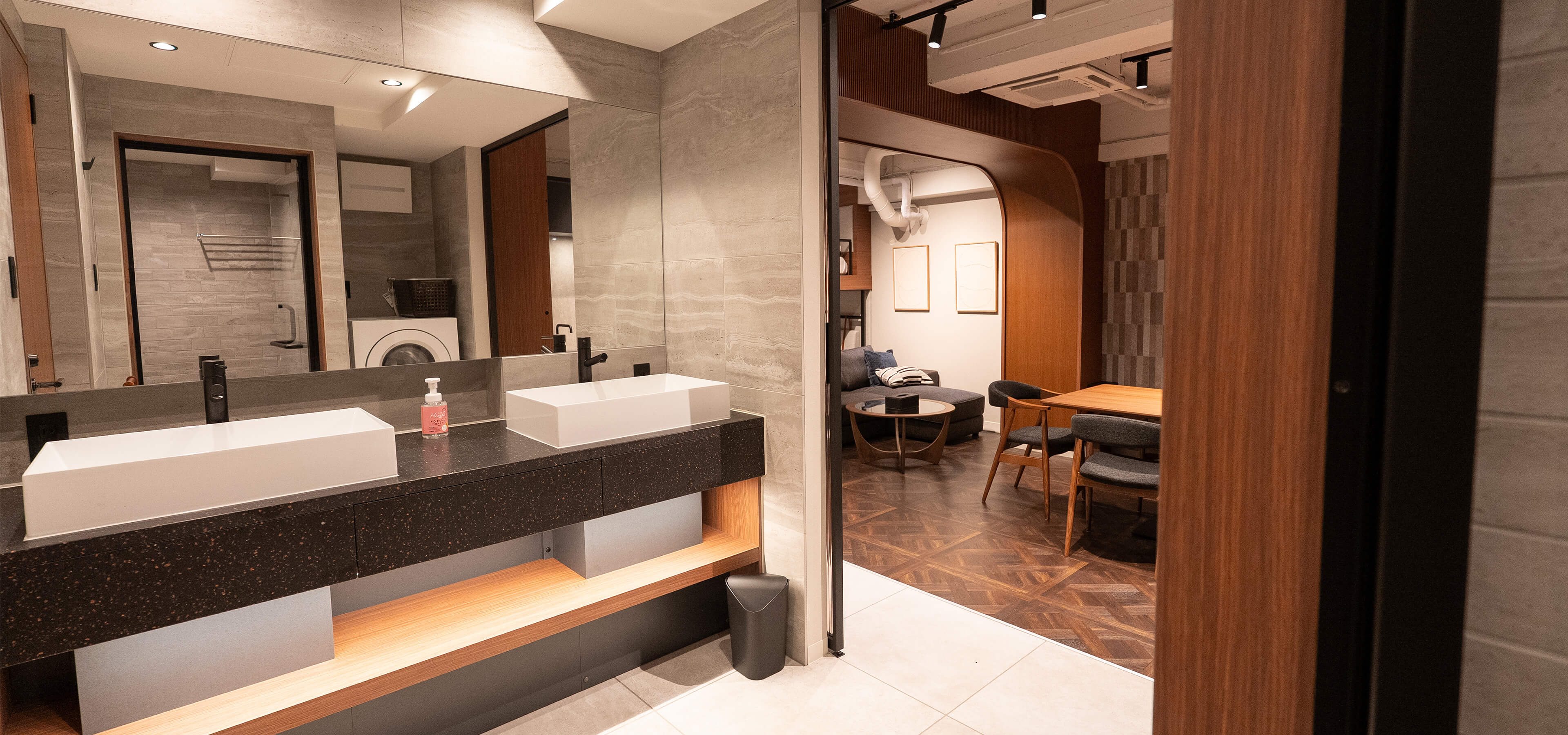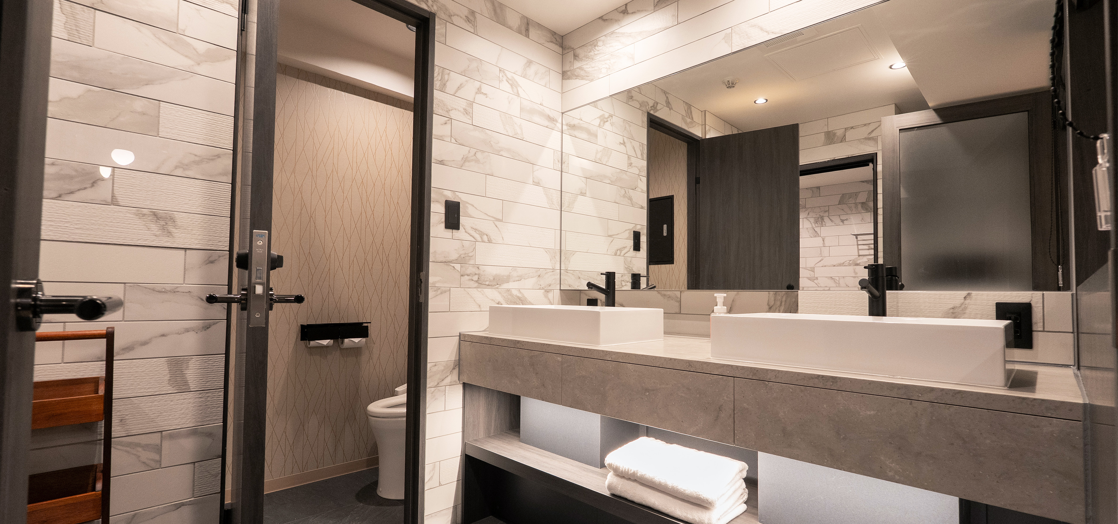 洗面所は広く、トイレは個室になっております。洗面台が2つあるので、大人数で泊まっても混み合わず快適です。