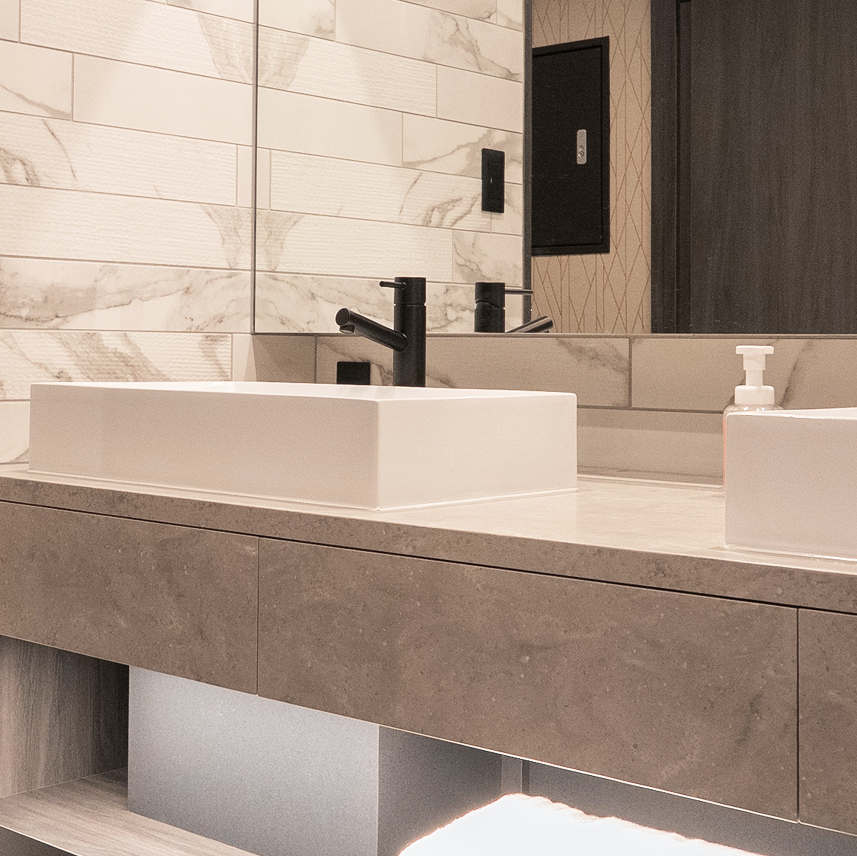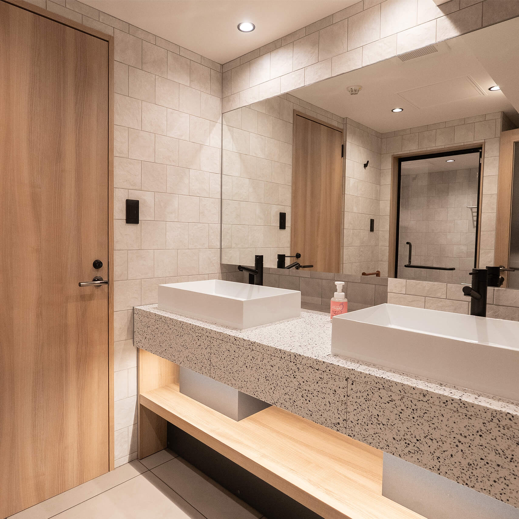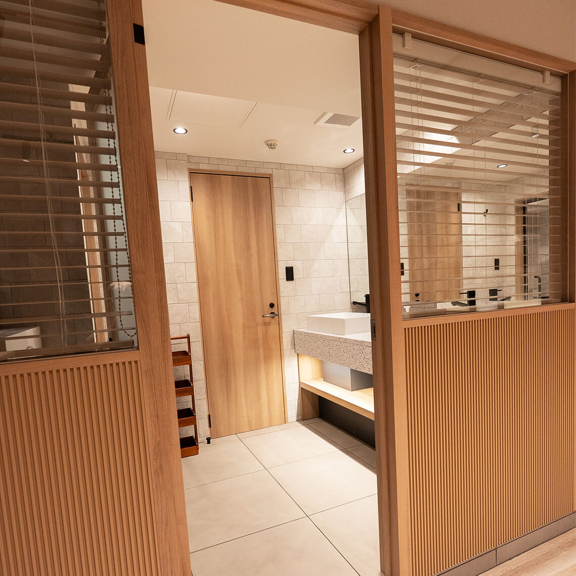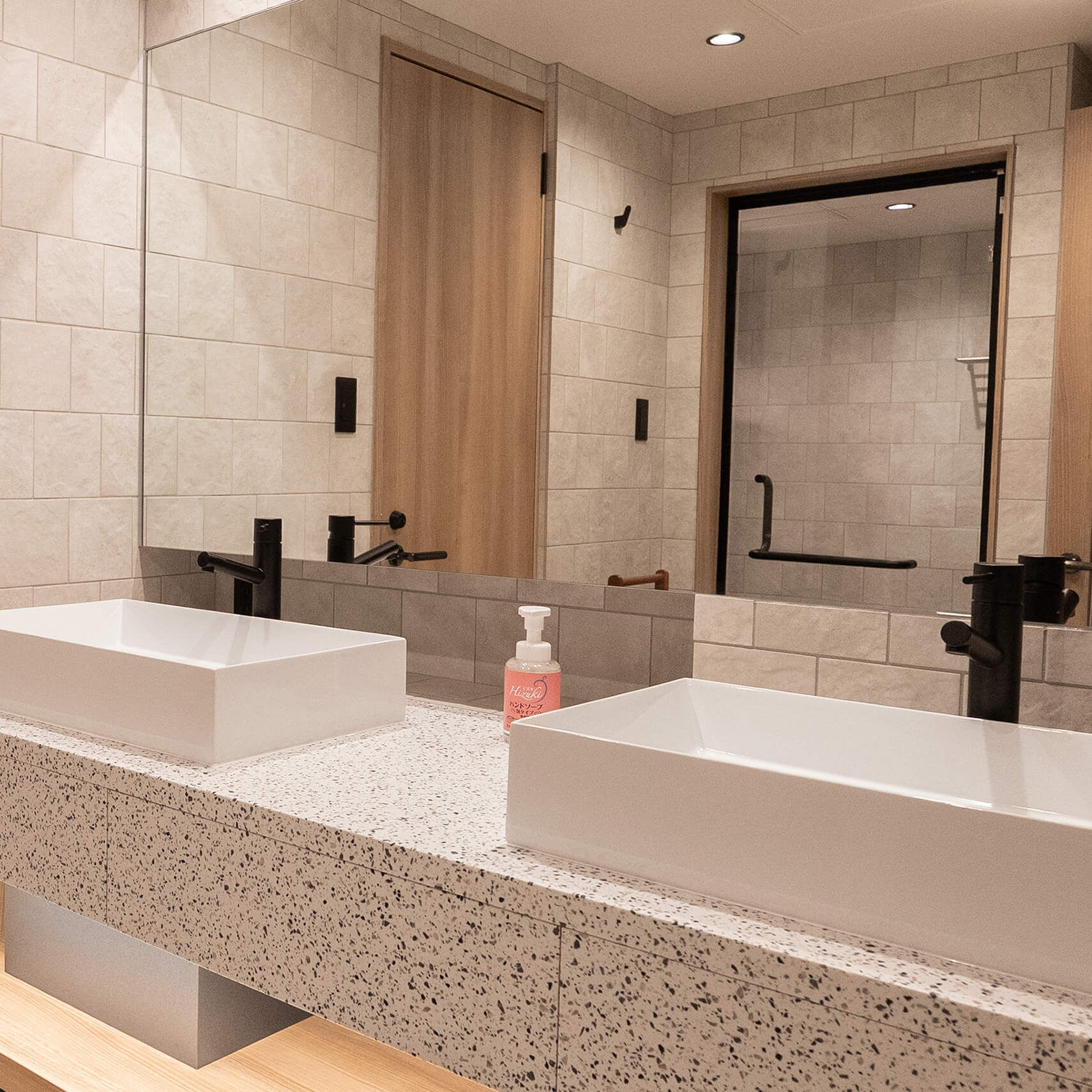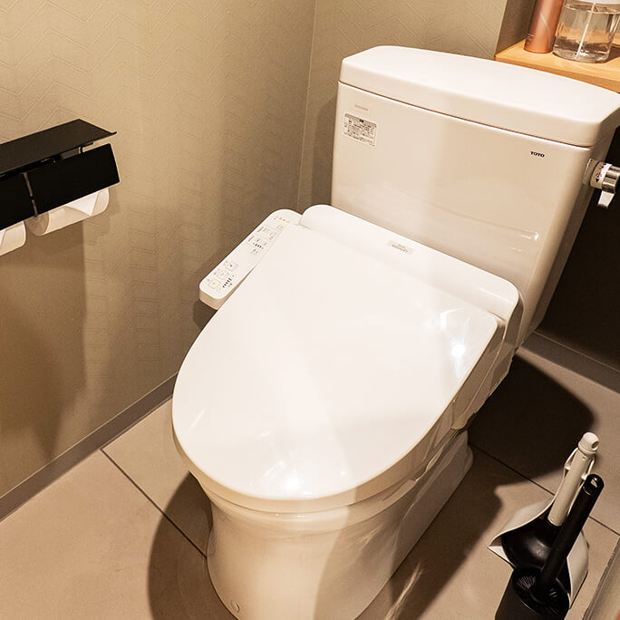 洗面所は広く、トイレは個室になっております。洗面台が2つあるので、大人数で泊まっても混み合わず快適です。