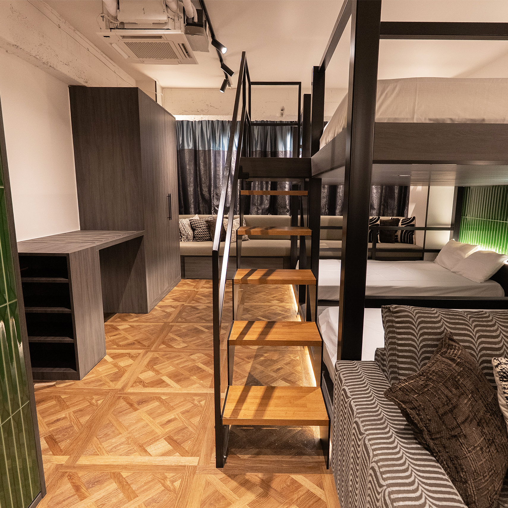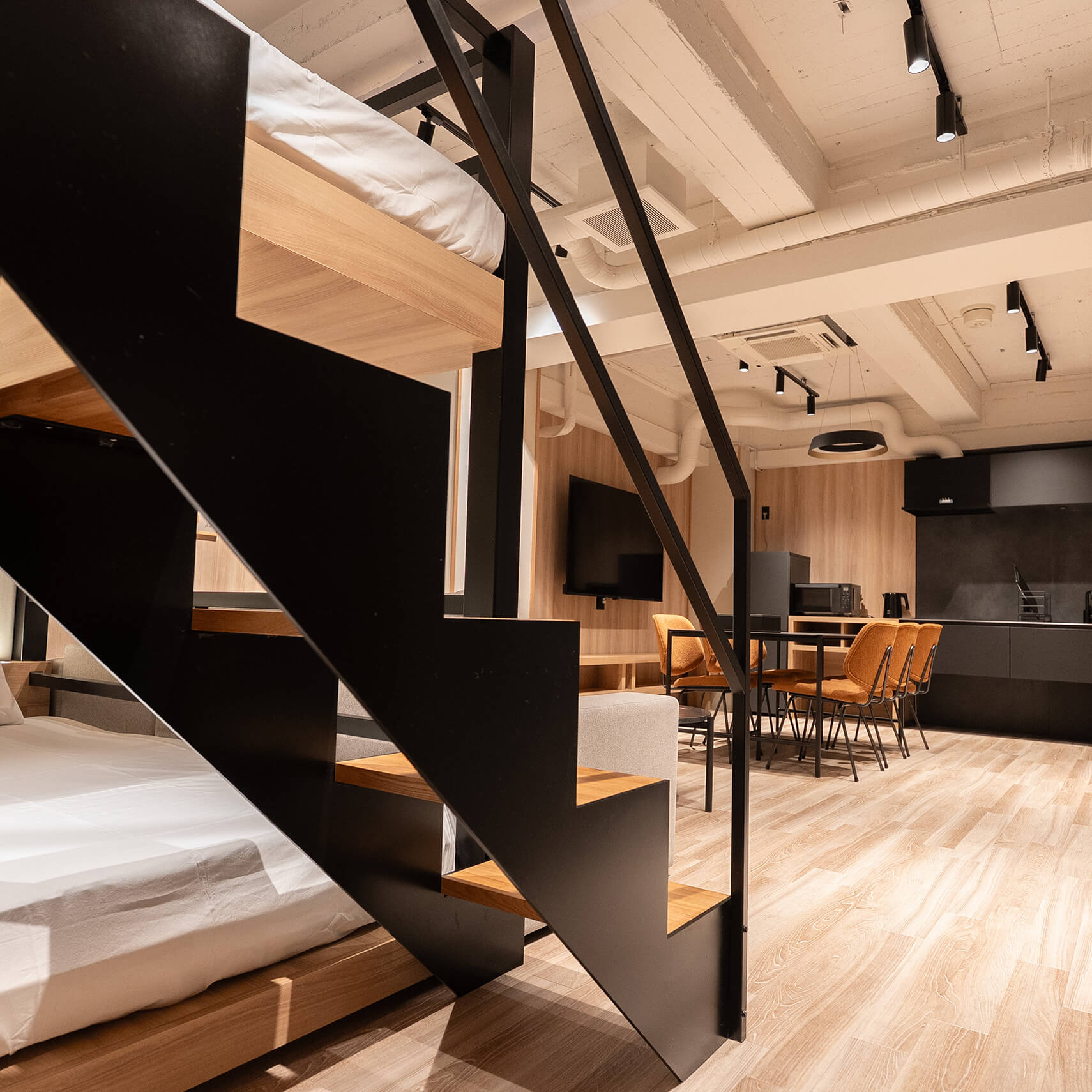 ベッドはダブルが4つ。階段が横についているタイプのお部屋となっております。